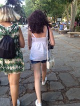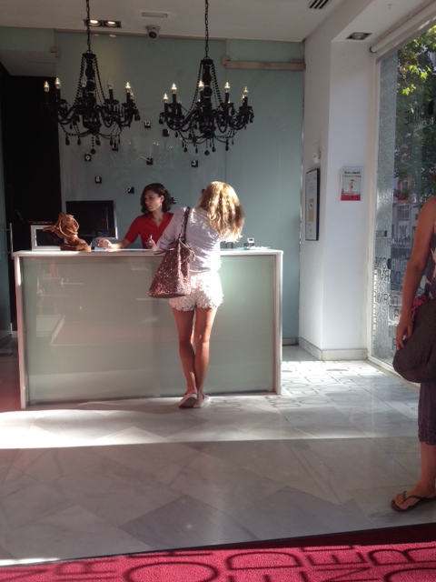 During our outings, I thought it would be fun to identify Madrid’s summer fashion themes.(Although, as you can see by the photo, Mags is a fashion statement, she does not qualify as a fashion theme, since she is only one person).   The first time I visited Madrid (1982?), I remember seeing a lot of flowery sun dresses.  This summer  — and Desigual notwithstanding —  shorts are everywhere. Some are really short, some are longer. They appear in all colors and fabrics.  Most are on tall skinny twenty-somethings with long hair but others enjoy them as way to stay cool in Madrid’s hot summer climate.