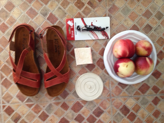 When omnivore Emily cooks vegan food,  she says “I like working with constraints.”  This morning after much teeth gnashing I committed myself to this approach.  I started by running some errands so I would at least have a false sense of empowerment.  The picture represents a cross section of my efforts.  A bar of hand made olive oil soap so I wouldn’t have to use the harsh stuff in my room that you can smell down the block.  A sink stopper so I can wash some of my clothes.  Some nectarines representing my upcoming three days of unprepared foods.  A pair of sandals because my flip flops are on their last leg (so to speak). And a new corkscrew because I can’t take the chance that the old one will bomb out on me before Sunday.