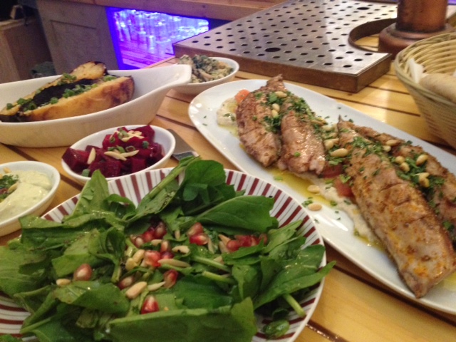 An amazing lunch feast at Sovita. BBQ’d bonita on spicy baba ganoush with five salads, ceviche and a roasted sweet potato. This is only half of it! I took most of it to my hotel for dinner.