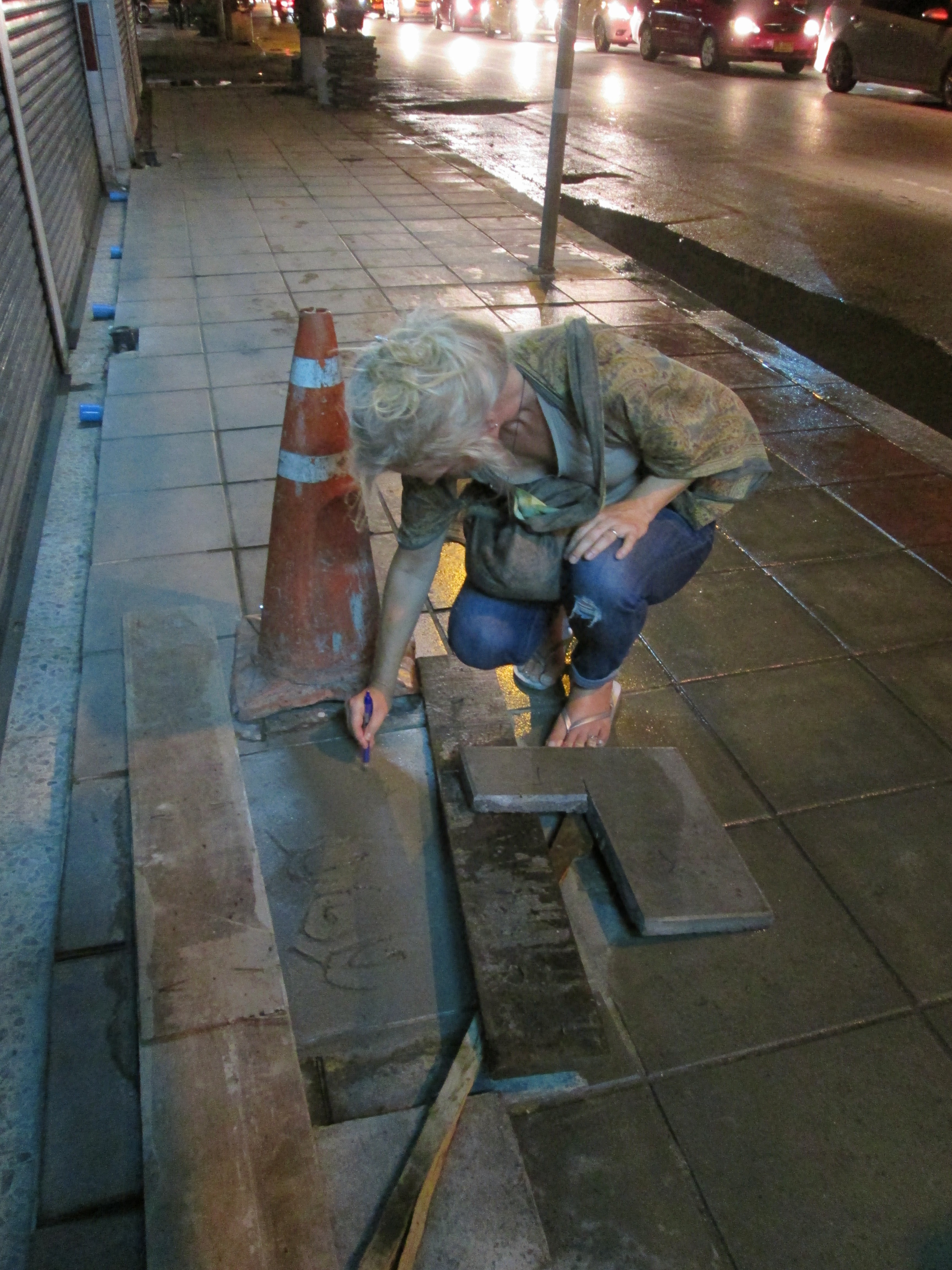 It is incredibly hot and humid here, with the heat dispelled every afternoon by an unpredictable downpour. One thing that helps me keep my sense of humor when I am sweating like a pig is Mags’ unauthorized activities. Her first night here she carved her name in somebody else’s wet cement.