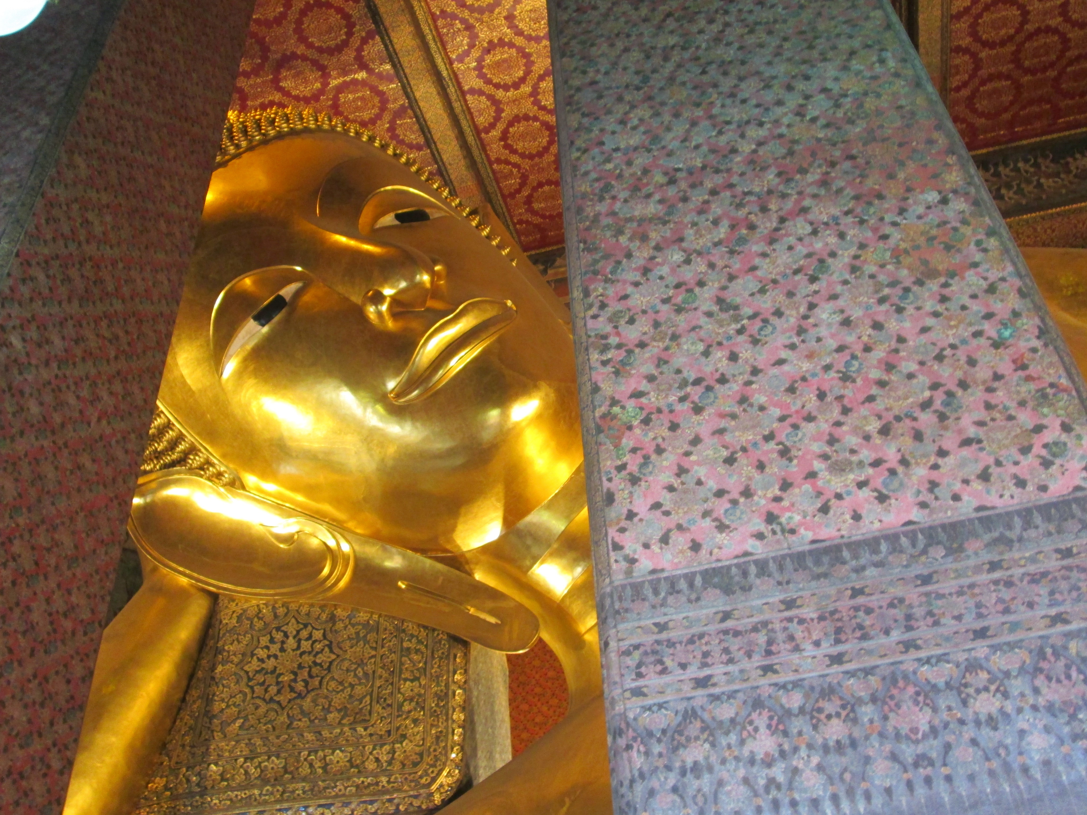 The reclining Buddha at Wat Pho is 45 feet tall and 130 feet long. It is beautiful.