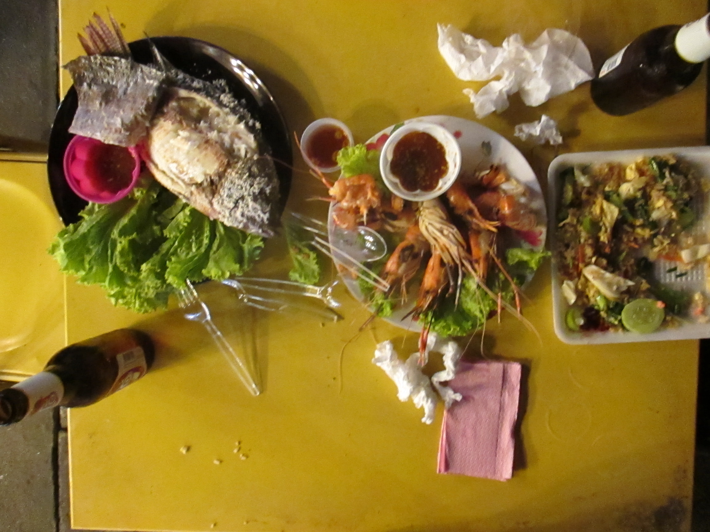 Great find at the night market — stuffed and grilled fish, barbequed prawns, fried rice and papaya salad. We washed it down with Thai beer.