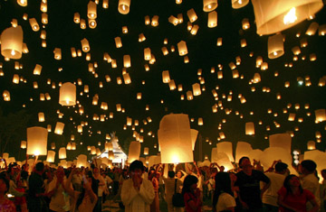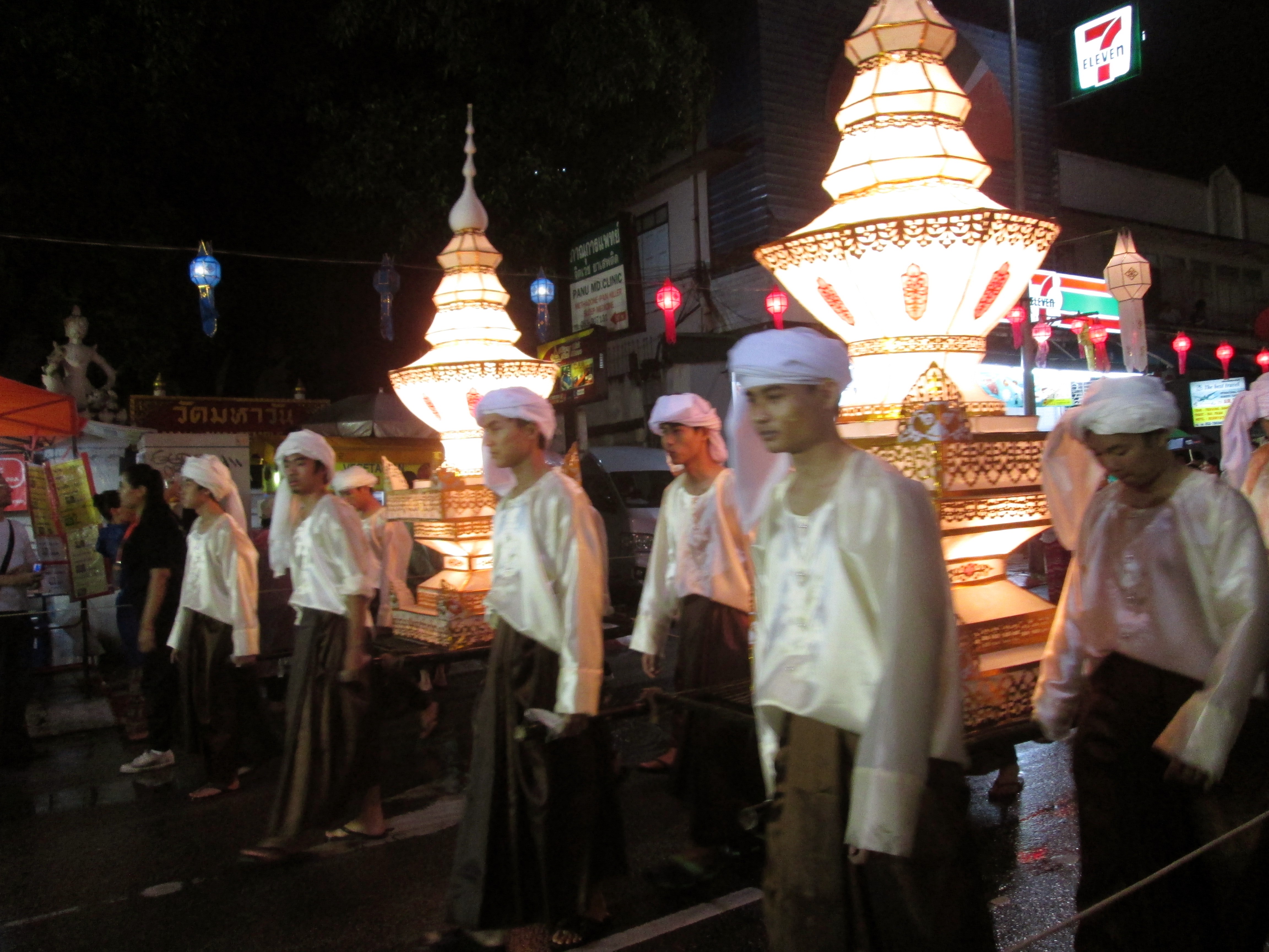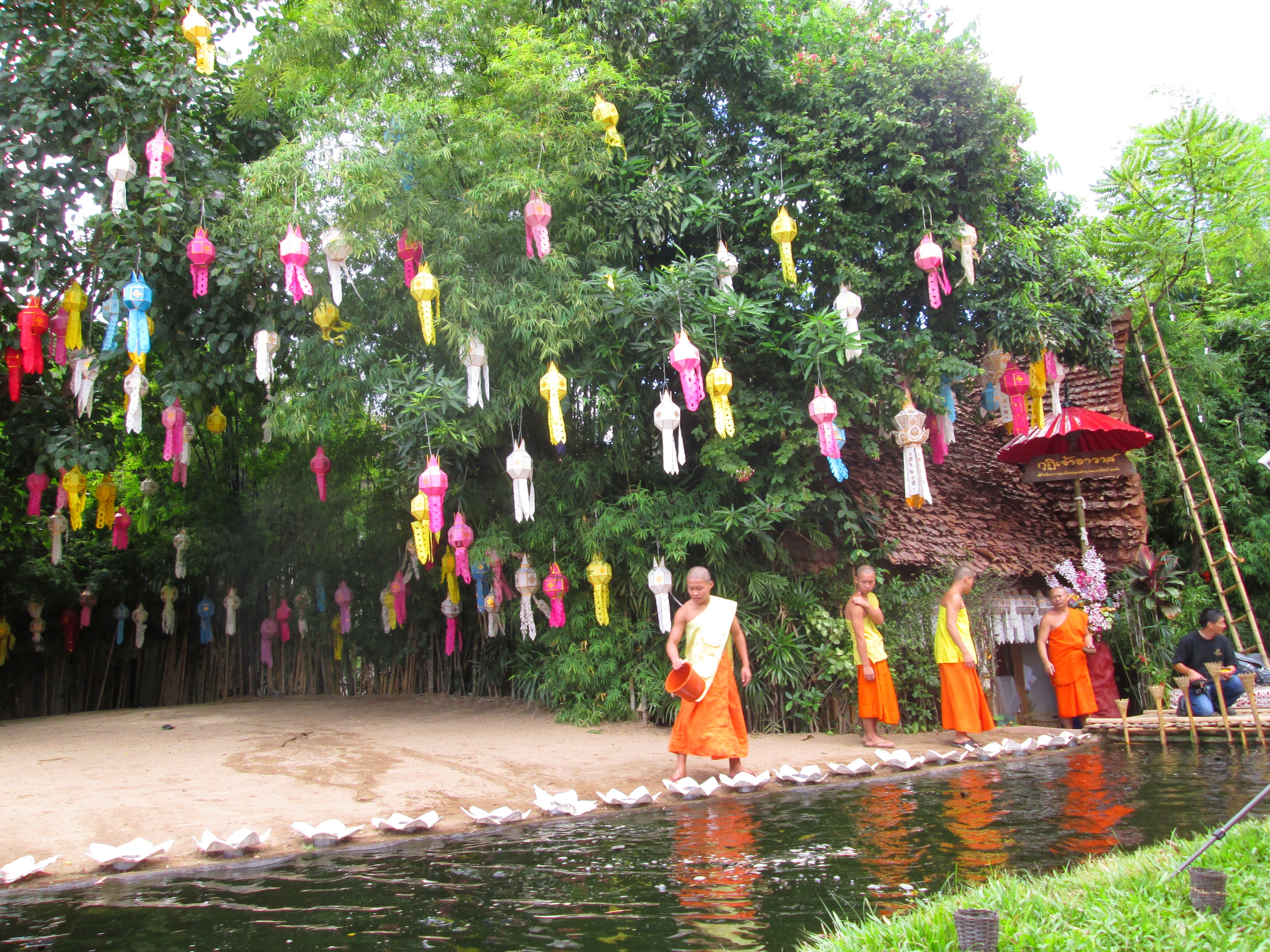 We have been happy happy happy in Chiang Mai during the three days of Loi Krathong, Thailand’s festival of lights. Loi Krathong celebrates water spirits with thousands of candle-lit lanterns set off into the skies, candle lit boats of flowers sent down the river, parades, music and fire works.