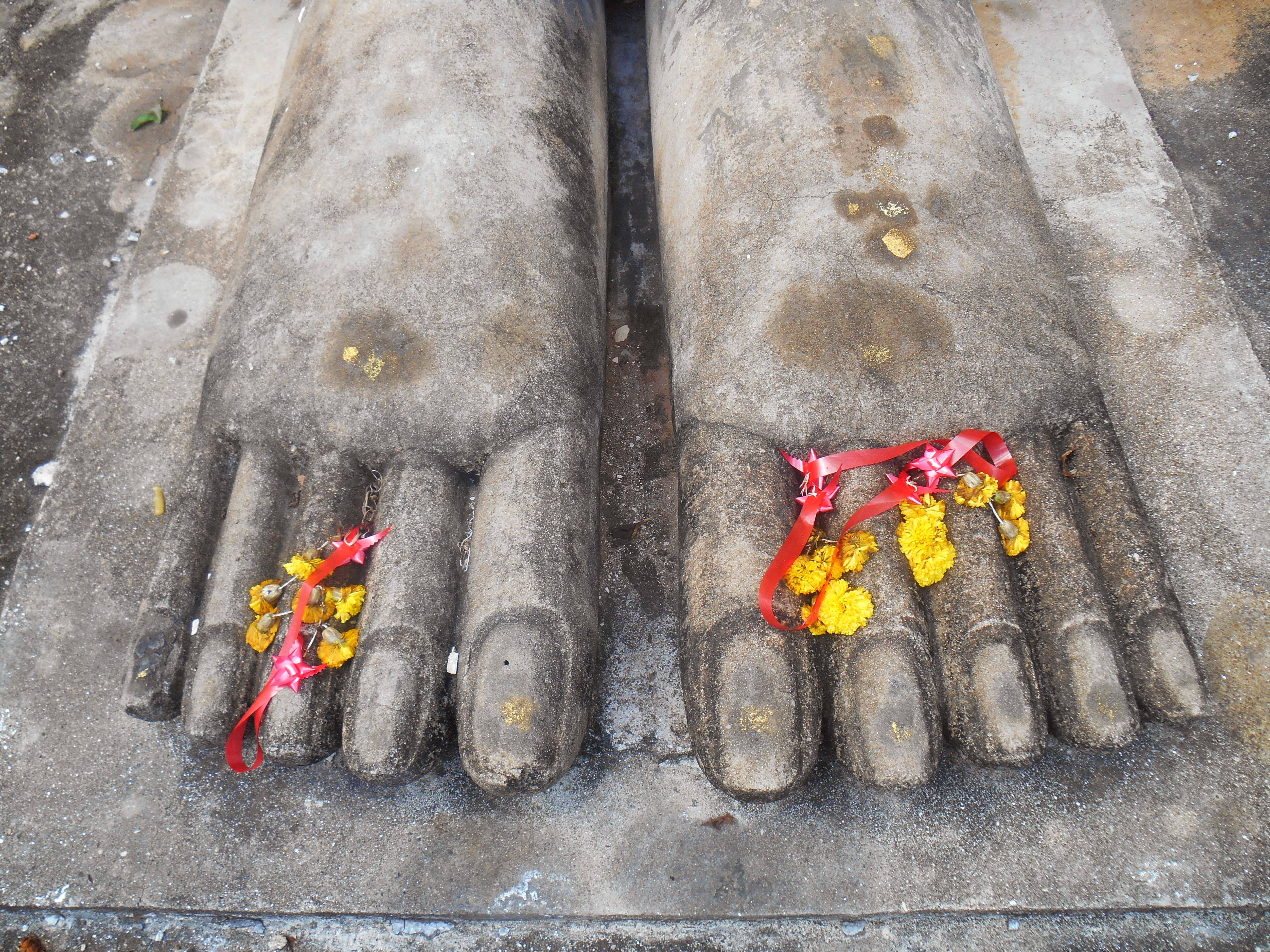 I am here to visit Sukhothai Historic Park, which is the site of the Kingdom of Siam’s first capital during the 13th and 14th centuries.  What remains of the original city is now a UNESCO World Heritage site and one of Thailand’s most important historic places.  The site includes more than a dozen wats (temples) within several square miles of beautifully kept grounds and jungle.  This morning, I hopped a local shuttle with a bottle of water and two cameras.  At the park entrance, I rented a bike and toured the site for three hours.  I deserve anything I want for dinner.DSCN0861