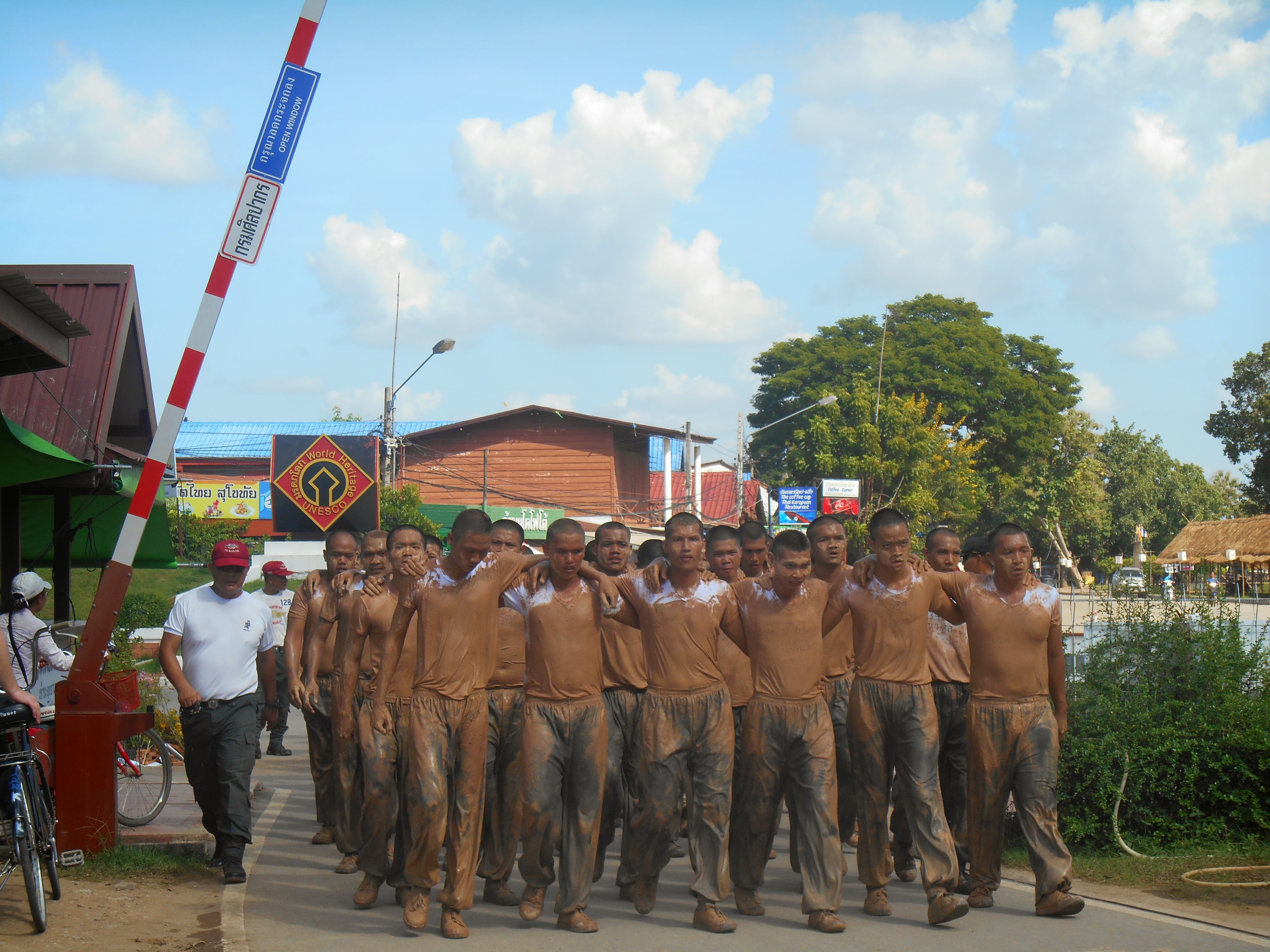 On my way out, I saw these young mud-covered men jogging and doing calisthenics through the site with an ambulance close behind.  They are trainees in the Thai National Police and presented quite a contrast to the Thais in the park who were bowed in prayer at the Buddha statues.  They deserve anything they want for dinner.