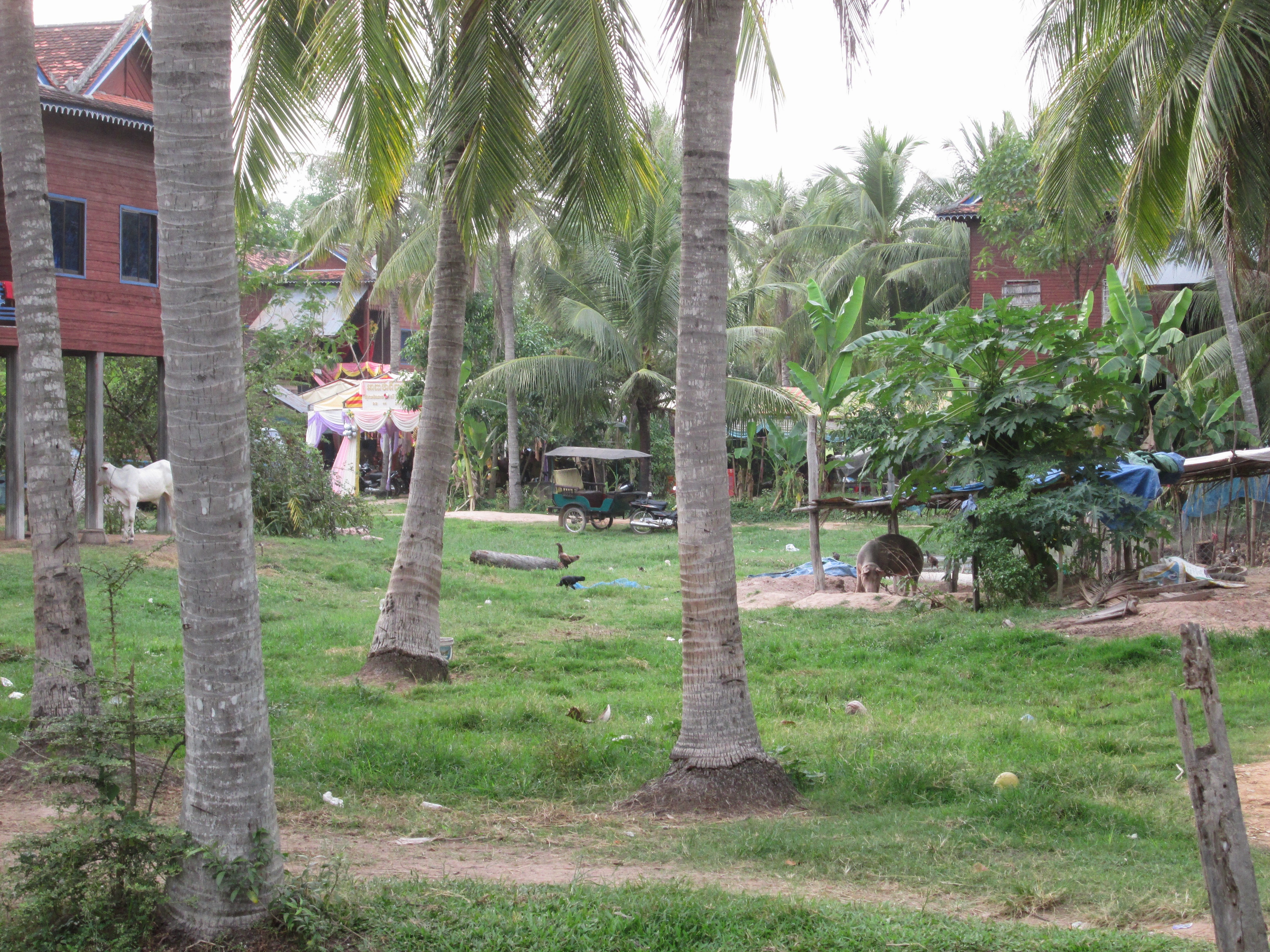 This photo has so many Cambodian things in it: house on stilts, pig, Brahman cow, tuk-tuk, tent for a Cambodian wedding, palm trees, and, unfortunately, plastic bags