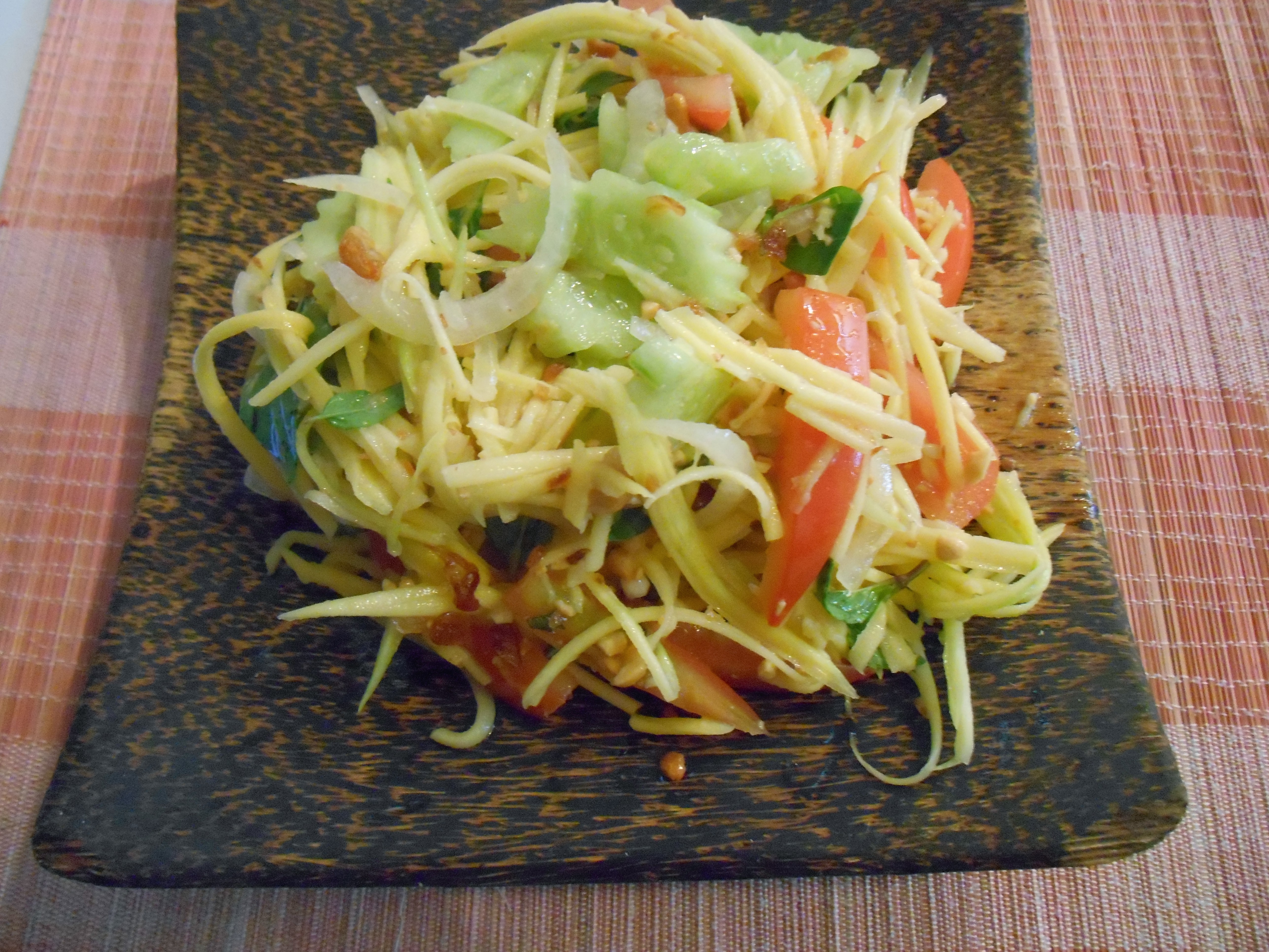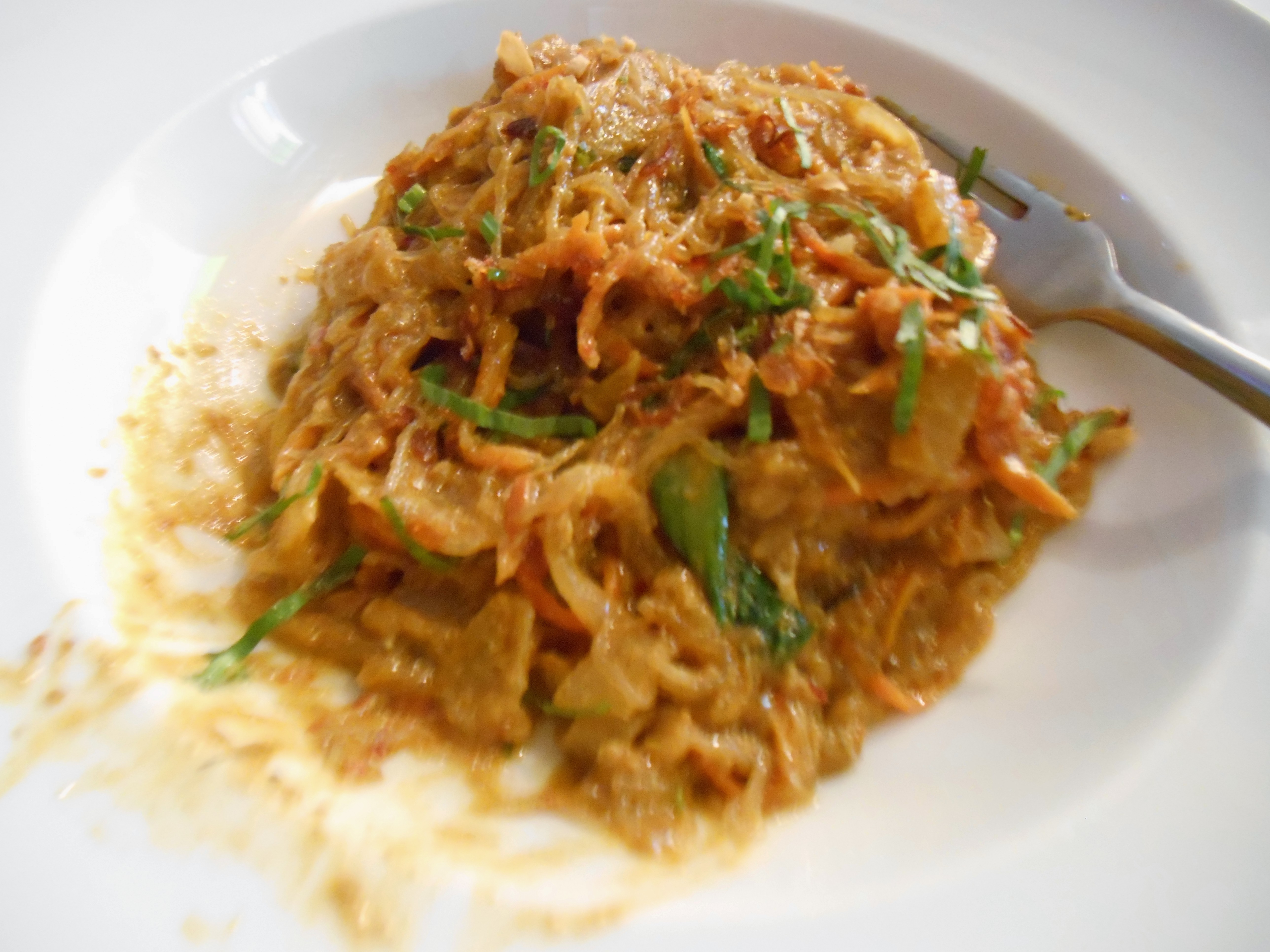 Another favorite is a tiny vegetarian restaurant called Chamkar. I didn’t expect much at Chamkar because it is just off of Siem Reap’s touristy Pub Street, where 50 cent beers are tonight’s dinner special. But Chamkar is fabulous. I had a dish of glass noodles and vegetables that had so many layers of rich flavors — guessing the usual curry ingredients with something umami, like mushroom broth or grilled onionis. The anonymous-looking blob of goosh is one of the most flavorful dishes I have had in Southeast Asia. I wouldn’t mention it to the chef, (jai yen is observed here too) but with a little heat and a little crunch, it would be almost perfect. Another time, I had a scrumptious green papaya salad with crushed peanuts, onions, tomatoes and a lime dressing.