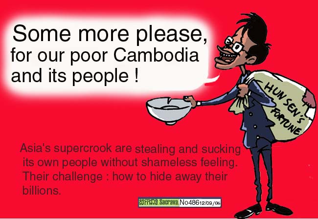 Most Cambodians do not have access to adequate food, sanitary facilities or clean water. Education is mostly for the elite or those lucky enough to attend a school run by foreign NGOs.  Over the years, Hun Sen has sold off the country’s natural resources to cronies and foreign governments, displacing thousands of farming families and trashing the natural environment. Corruption is institutionalized at all levels of government at the expense of the national economy and the vast majority of the Cambodian people. Western countries and the UN have aided and abetted Hun Sen by ignoring the abuses and providing him with billions of dollars in aid for which Hun Sen has never been held accountable.3472122218