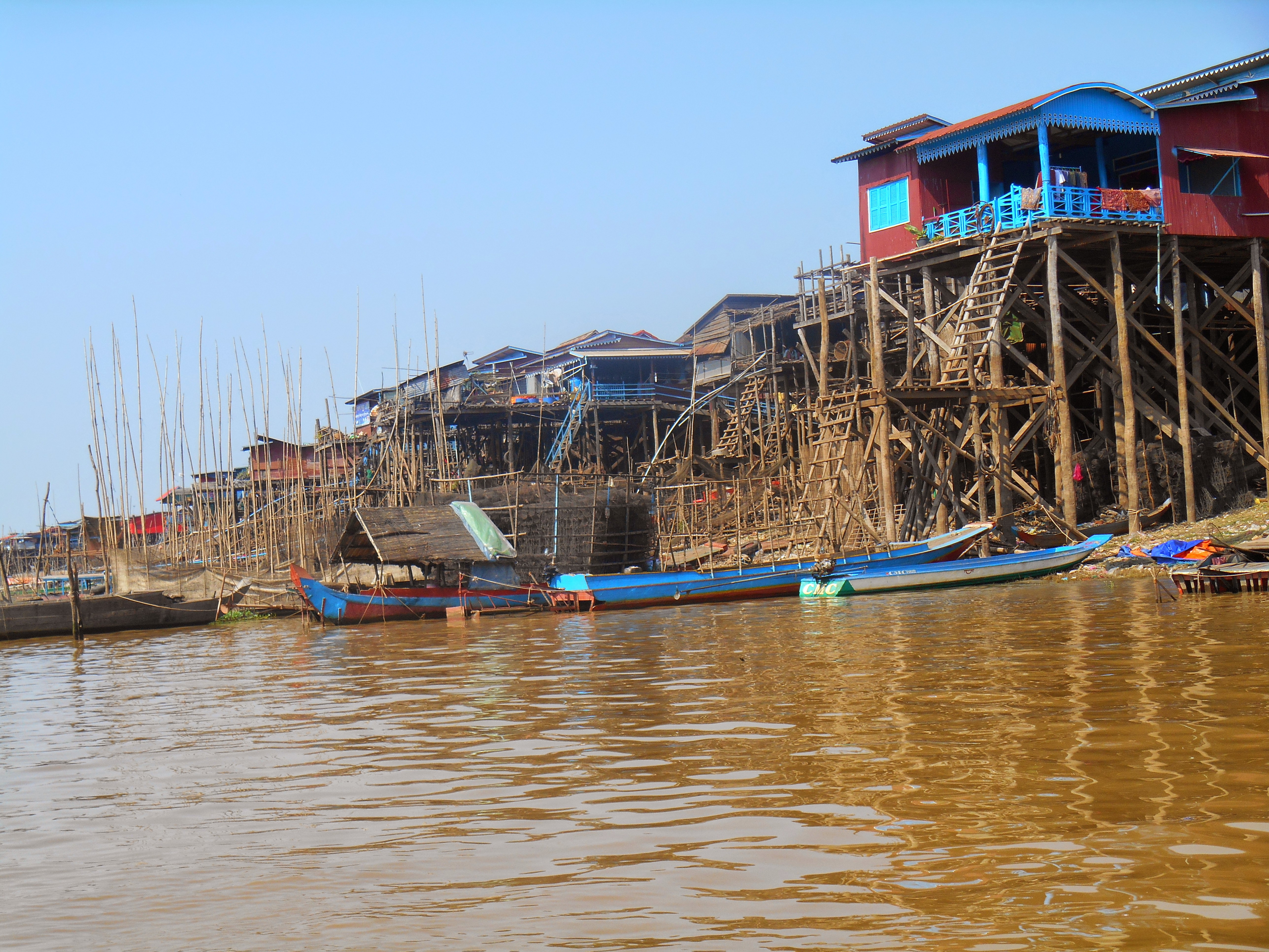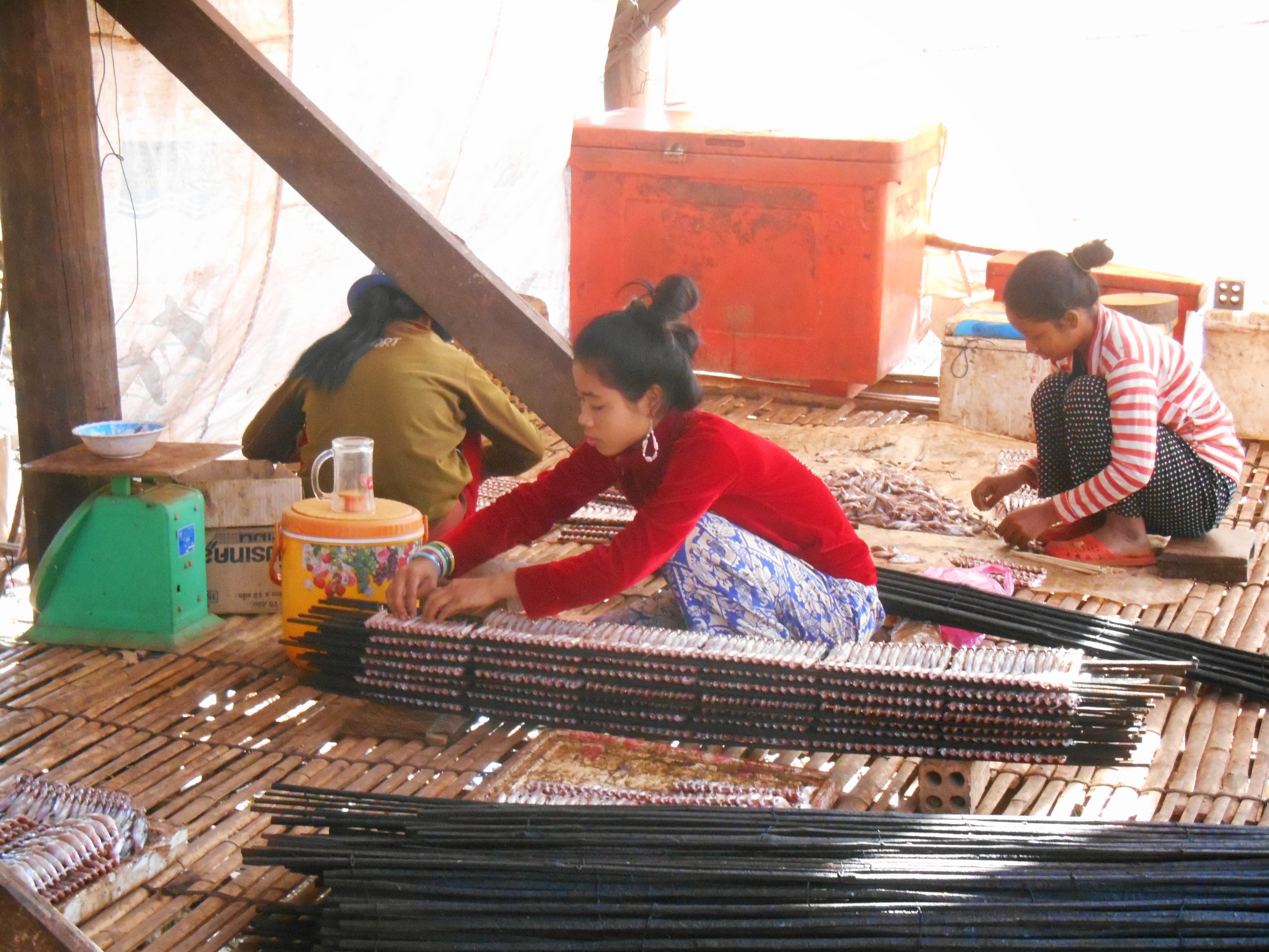 We arrived at the lake after an hour on back roads through rice fields and, well, really just rice fields. Our first stop was a small village that is built on stilts. During rainy season, the water rises so high that the stilts disappear and all transportation is by boat. The main work in the village is processing fish from the lake, mainly drying anchovies and making a very strong fish sauce called “prahak.” The whole village is super stinky! (I am fighting back the urge to say “and the smell is the only thing the guy in our tour group with the 20 pound Nikkon camera didn’t photograph”).