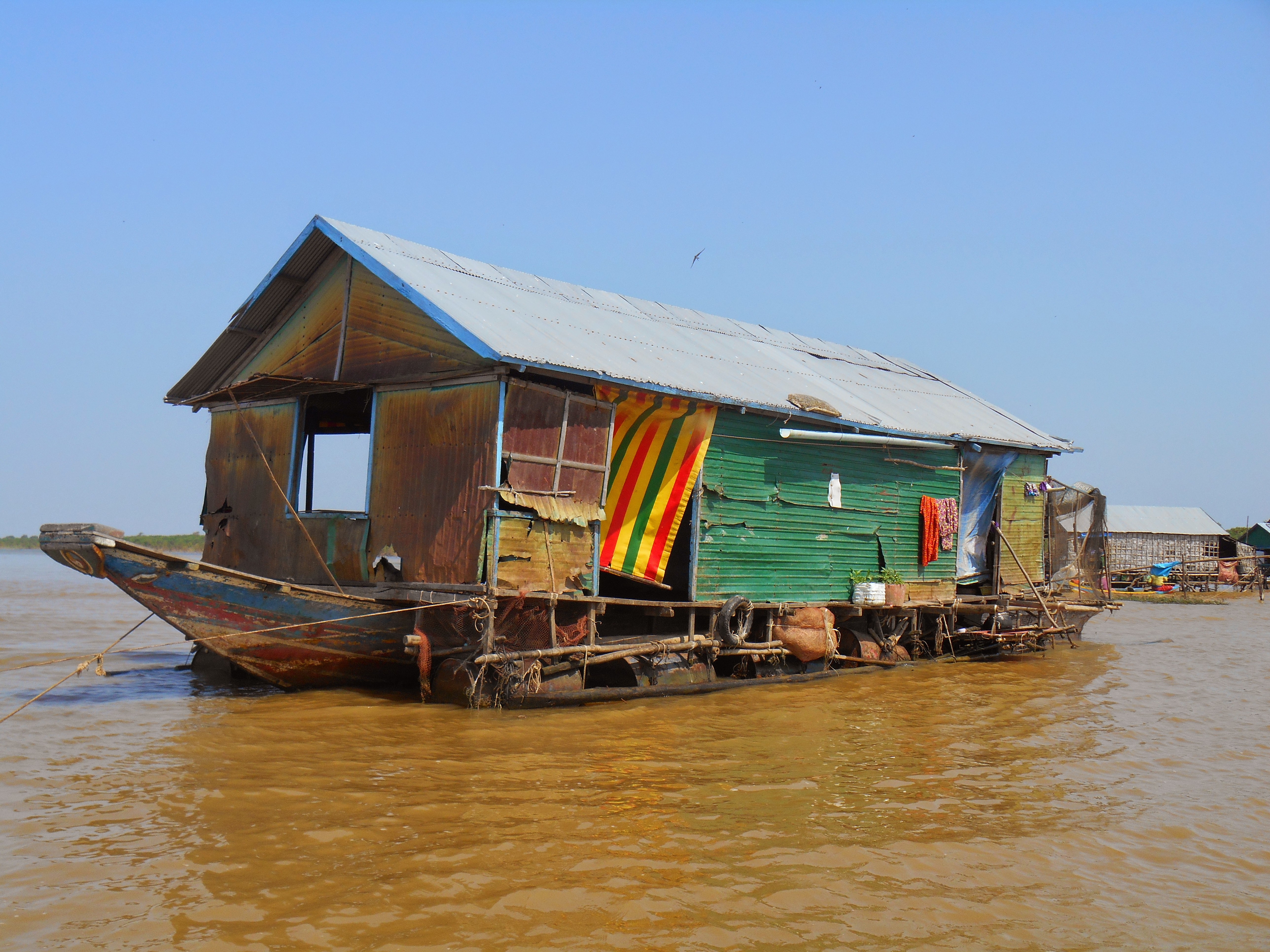 Then we went a couple of miles to a larger village built on higher stilts and boarded an old wooden boat powered by a barely willing diesel engine. Our destination was a floating village about an hour out into the lake.