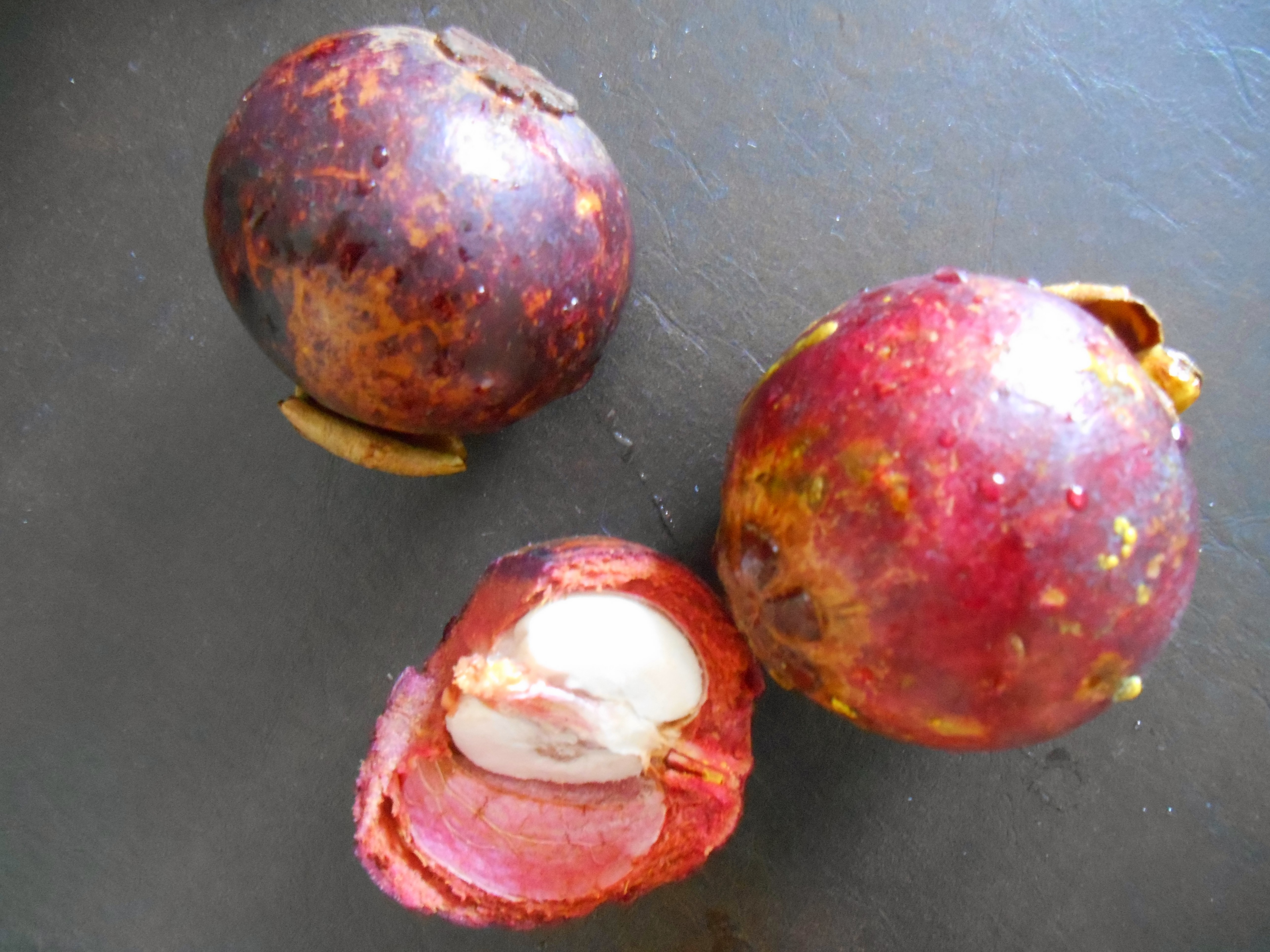 A favorite of Queen Victoria (and me), the Malaysian mangosteen has sweet, perfumy, juicy insides. They are illegal in the US, which explains why they are so expensive at the markets in Oakland’s Chinatown.