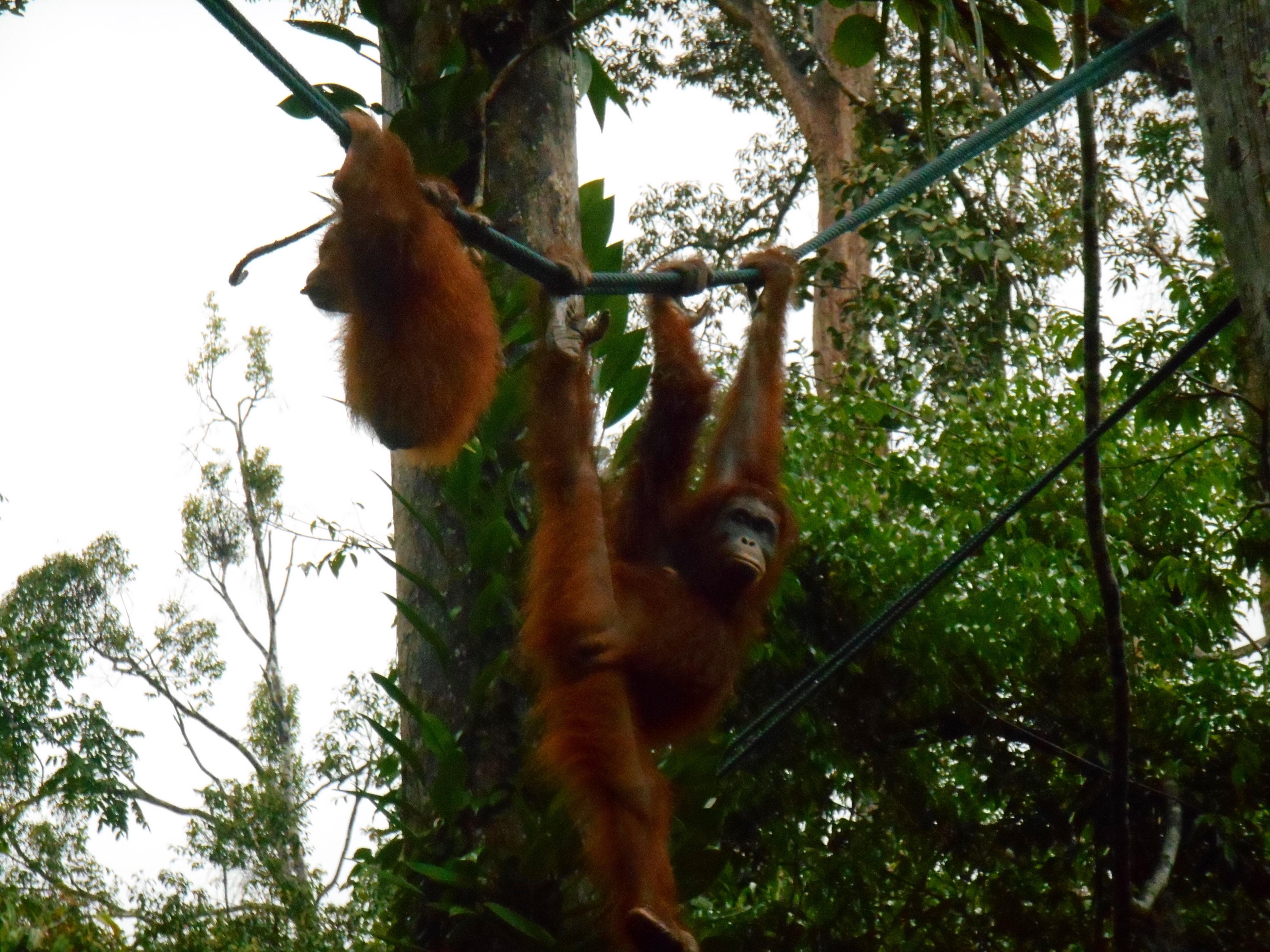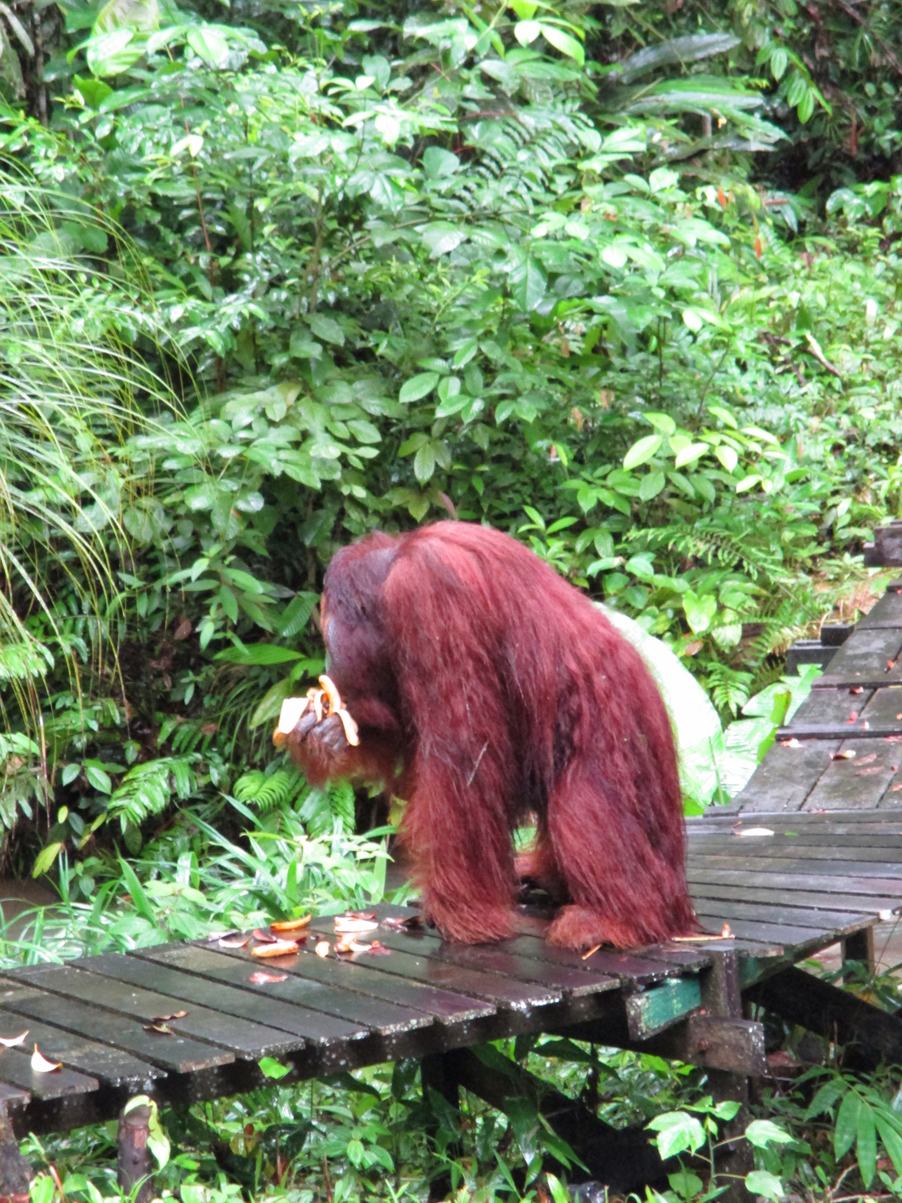 And I am in Borneo! Land of orangutans and jungles and headhunters! No sign of headhunters but I spent a morning hanging out at a national park, where neither the orangutans nor the people are in cages or behind fences. The orangutans don’t always come down from the hills for breakfast but five of them came down today and were very comfortable hanging out with 20 happy tourists.