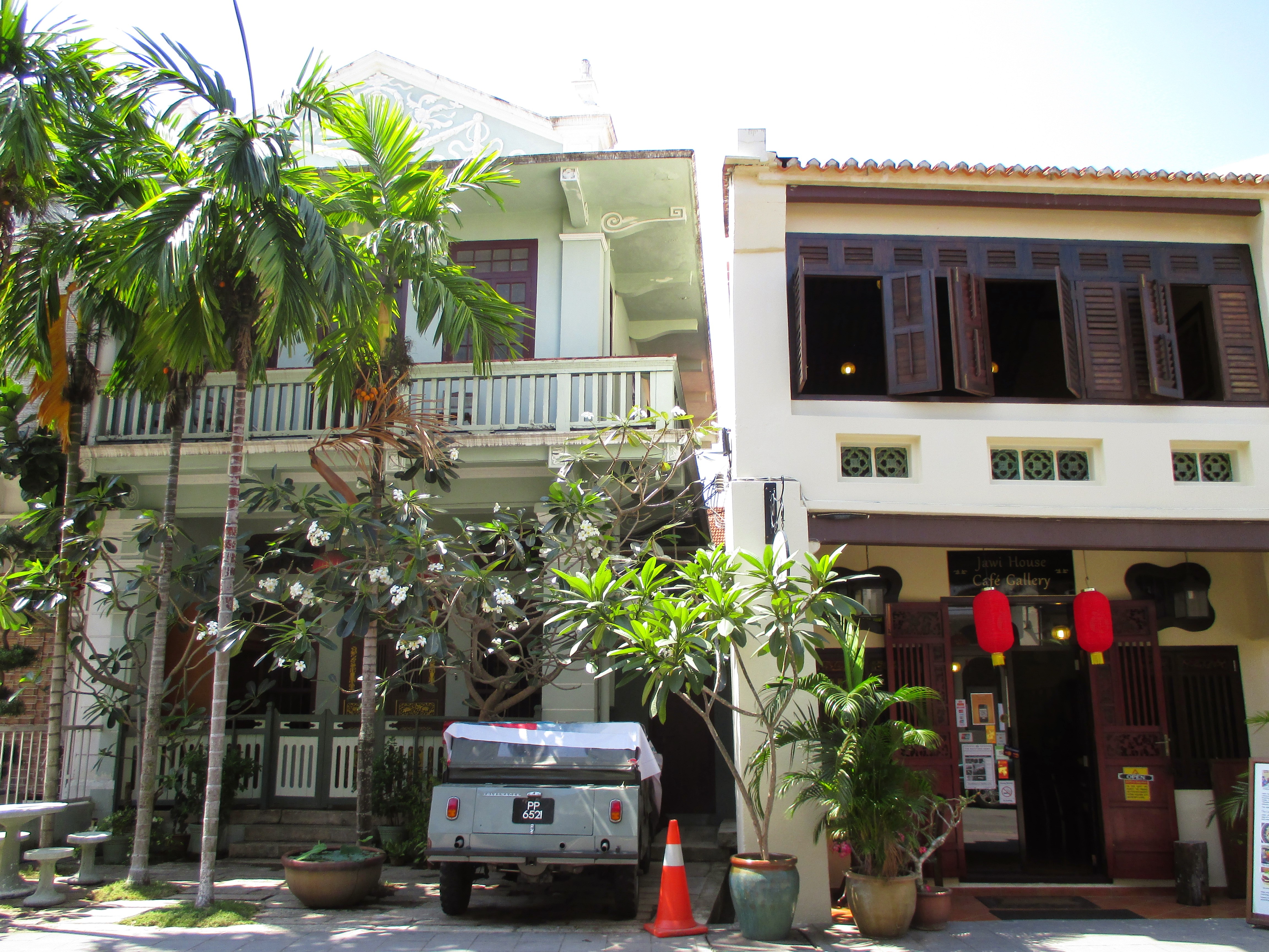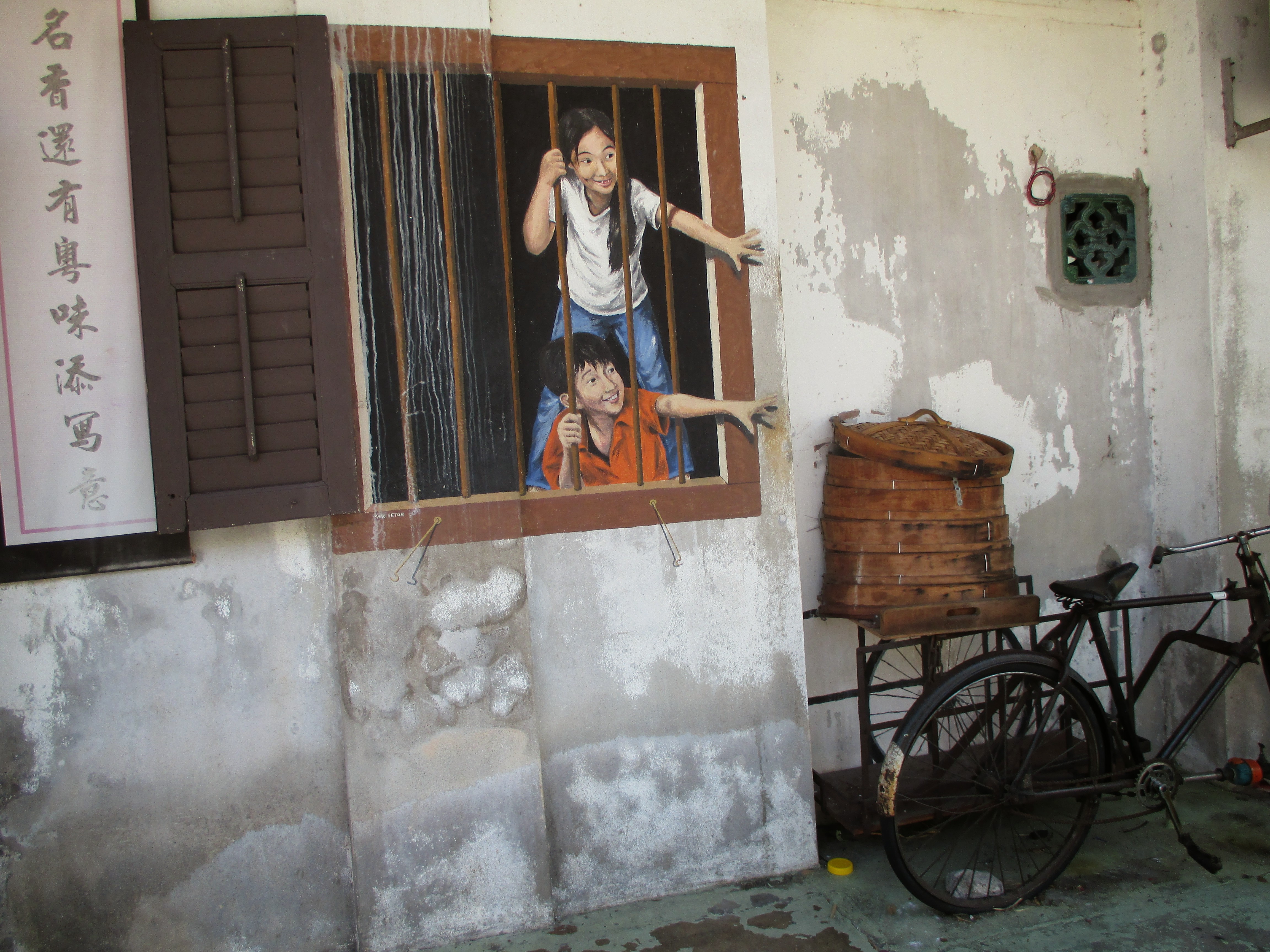 After checking into my hotel, I took off for a walk to find an electrical socket adapter. (In a town that is new to me, I usually start with an errand that requires me to walk a lot). I found one in a hardware store that was like the ones in the US where you can find stuff that has been on the shelves since 1921. Most of Old Town is nothing fancy but it has a lot of personality and feels loved. The streets smell like Chinese and Indian herbs and spices, frangipani blossoms, and incense from the temples and small alters along the sidewalks. Old Town is full of busy cafes and food carts, bright colors next to faded paint, Chinese temples, Muslim mosques, and Georgetown’s famous wall art.