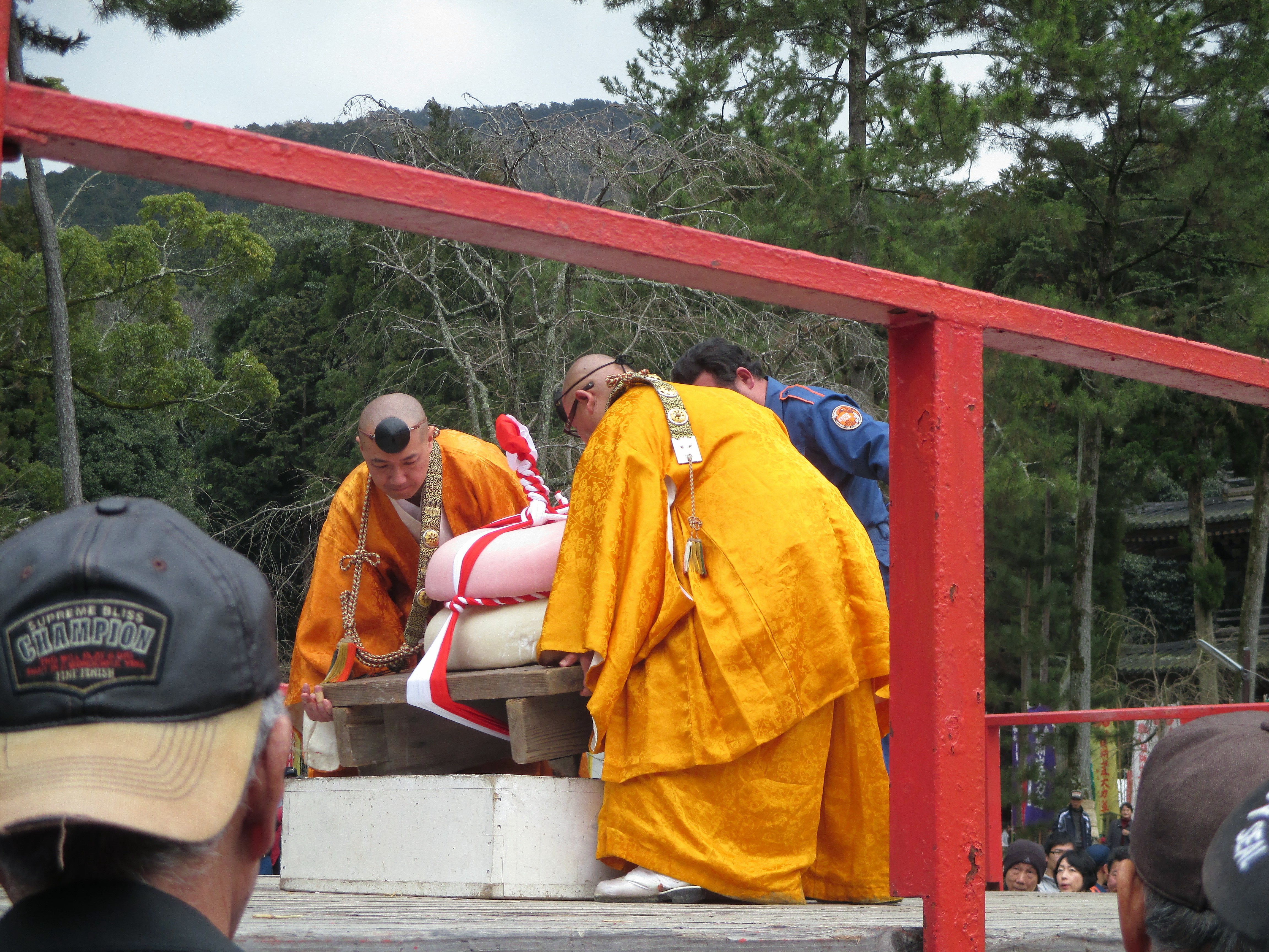 These two monks are supervising the rice cake lifting contest. The man in the blue jacket behind them was one of the contestants. I didn’t know people still wore caps backwards.
