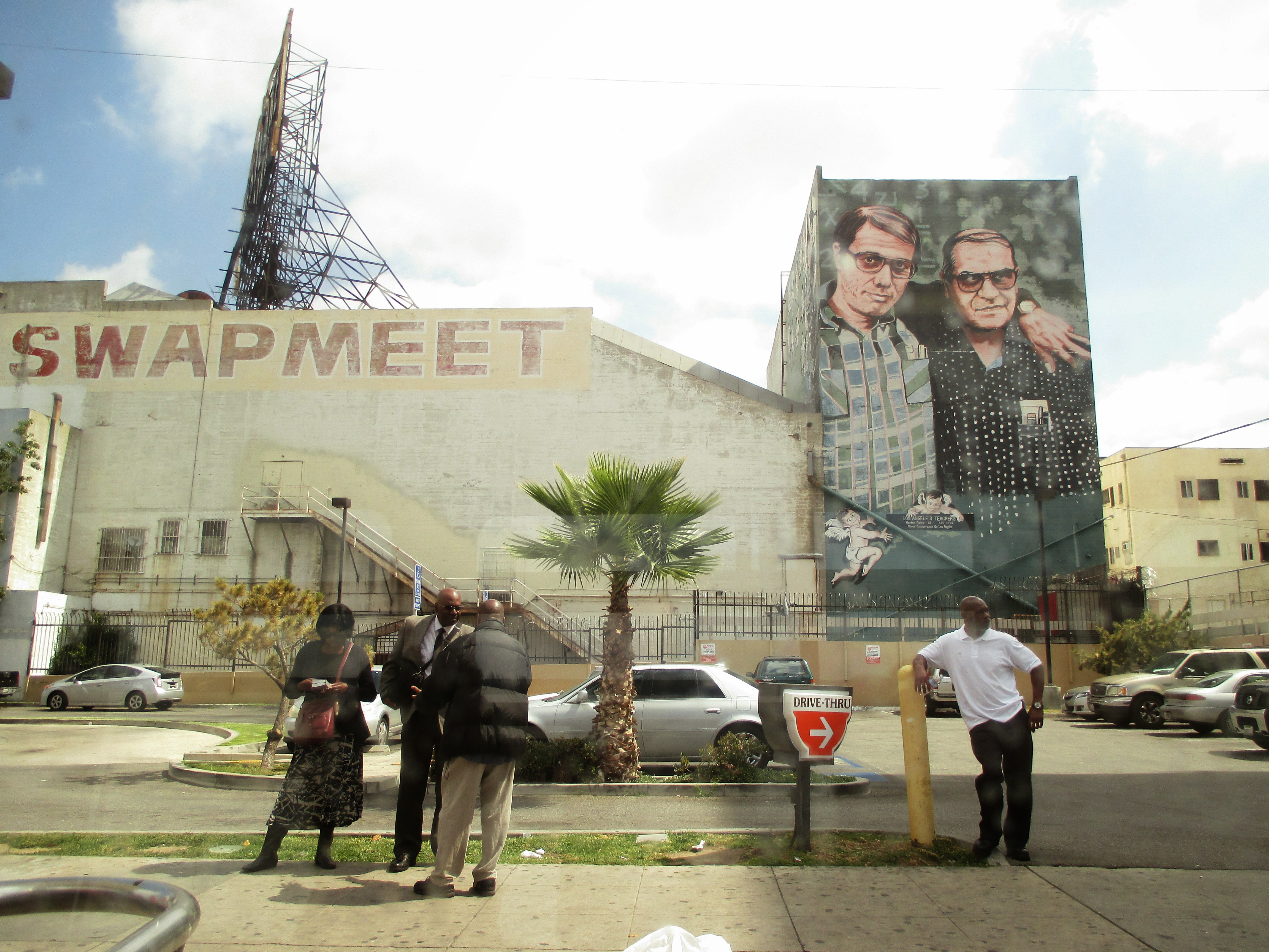 Seen on the bus from Bunker HIll to LACMA. I love this photo even if it does have window glare. The arrow, the stunted palm tree, the real and painted people, the swap meet sign. It all adds up to something.