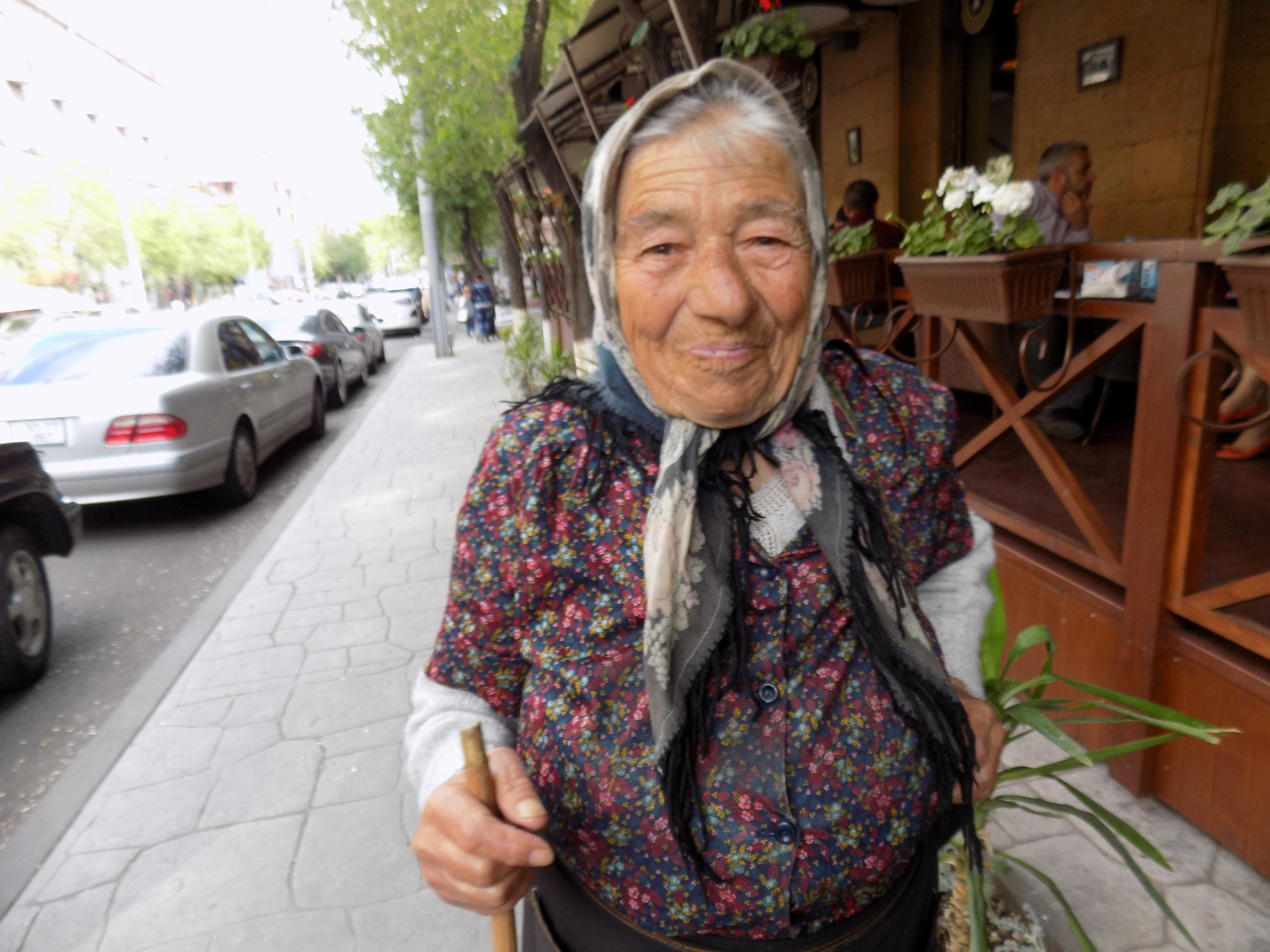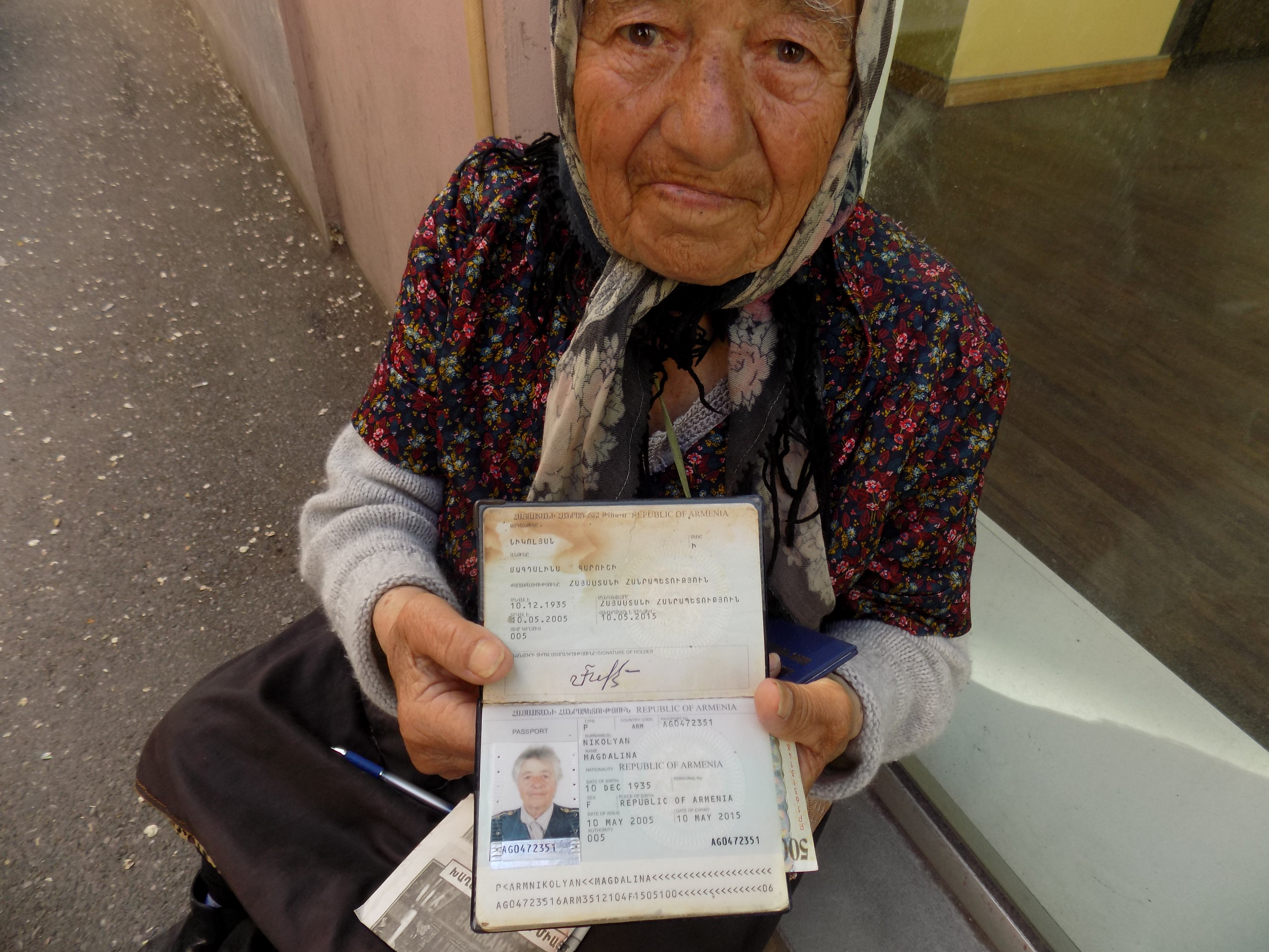 Magda was begging for change when I was having coffee at an outdoor cafe. I gave her a few thousand dram and she invited me to take her picture. Then she wanted to talk about her life a little — I couldn’t understand much but I think I understood that she is homeless and occasionally lives with her brother. She has not always been destitute. She showed me what I originally thought was her Soviet-era passport. But it expired last year. In the passport photo she looks like a lawyer or an accountant. What happened in her life?. She was lovely. I will look for her again tomorrow.