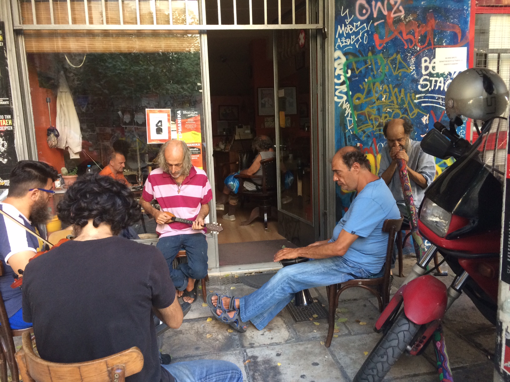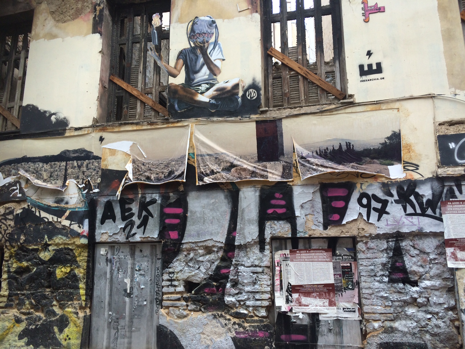 IMG_0111 (1)Exarchia is also home to a dozen or so “squats,” abandoned buildings that have been appropriated by anarchists on behalf of refugees.  Hotel Oniro, for example, houses about 150 people, mostly Syrians. By the standards of the affluent, the place is a hot mess, literally. The heat accumulates and hangs in hallways and bedrooms.  Human smells compete with smells of old upholstery and infrastructure. Visually, it is lacking in care or character.  And yet it provides special privileges to the people who live there.  Unlike the camps, Oniro has no military or police presence.  Instead of standing in lines for a handful of diapers or  a plastic bowl of noodles, the residents can cook real food and walk through real streets and congregate with people who aren’t volunteering for anything. Money is a problem in the squats and apparently so are drugs and smugglers, but these problems are also present in the government camps. It’s what happens when traumatized people live in limbo, without jobs or school or family.IMG_0087 (1)