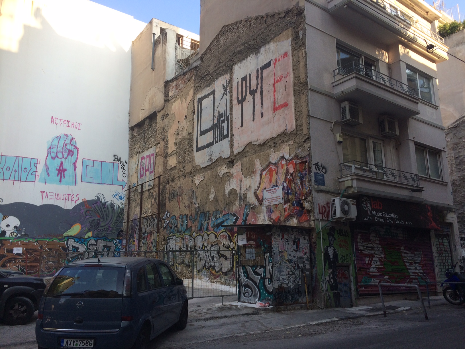 I am staying in Exarchia, a neighborhood on the north corner of the city’s center.  I chose it partly out of curiosity. Exarchia is full of intellectuals and anarchists.  It is dirty and gritty and covered in graffiti. At night, the square is full of young people and families speaking different languages, eating, drinking, dancing. Exarchia is a place of demonstrations and book stores and panhandling. A shopkeeper told me the police don’t come here so it is safe.