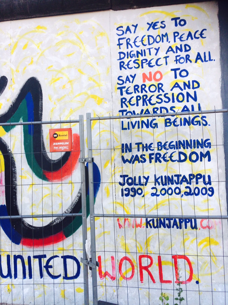 I have been spending a couple of days in Berlin doing the things tourists do — walking, eating, museums. Berlin is beautiful and clean and civilized. I have enjoyed all of it but what will always stay with me is the time I spent at the Berlin Wall.