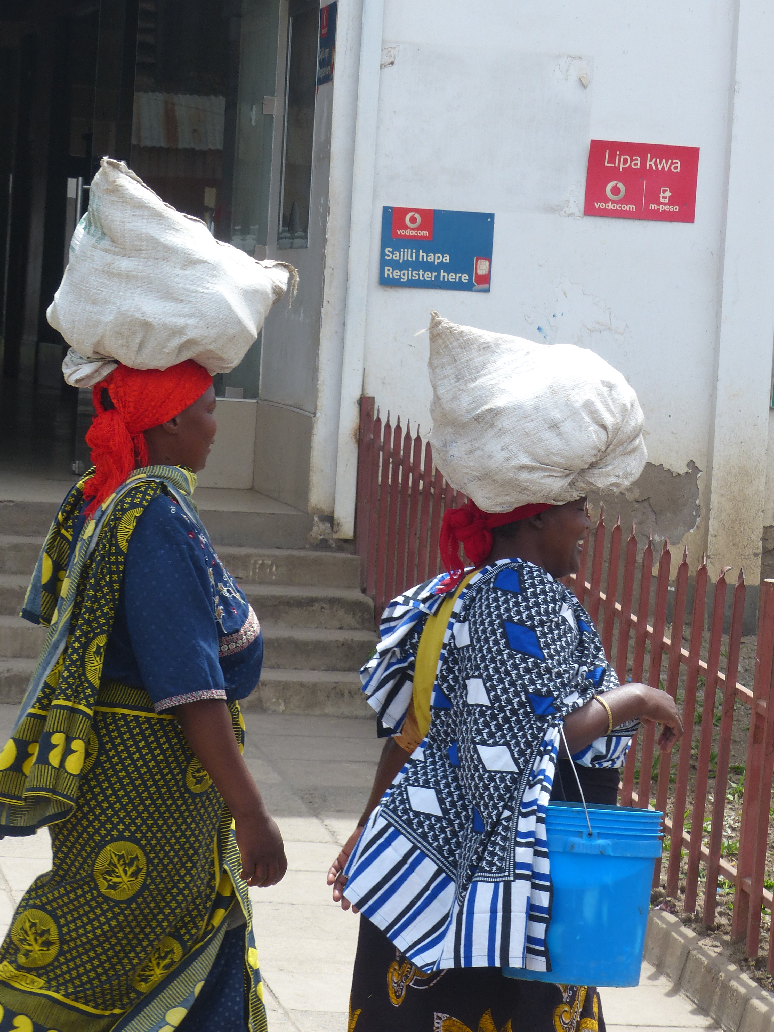 The women wear brightly colored traditional dress and carry pretty much anything on their heads.
