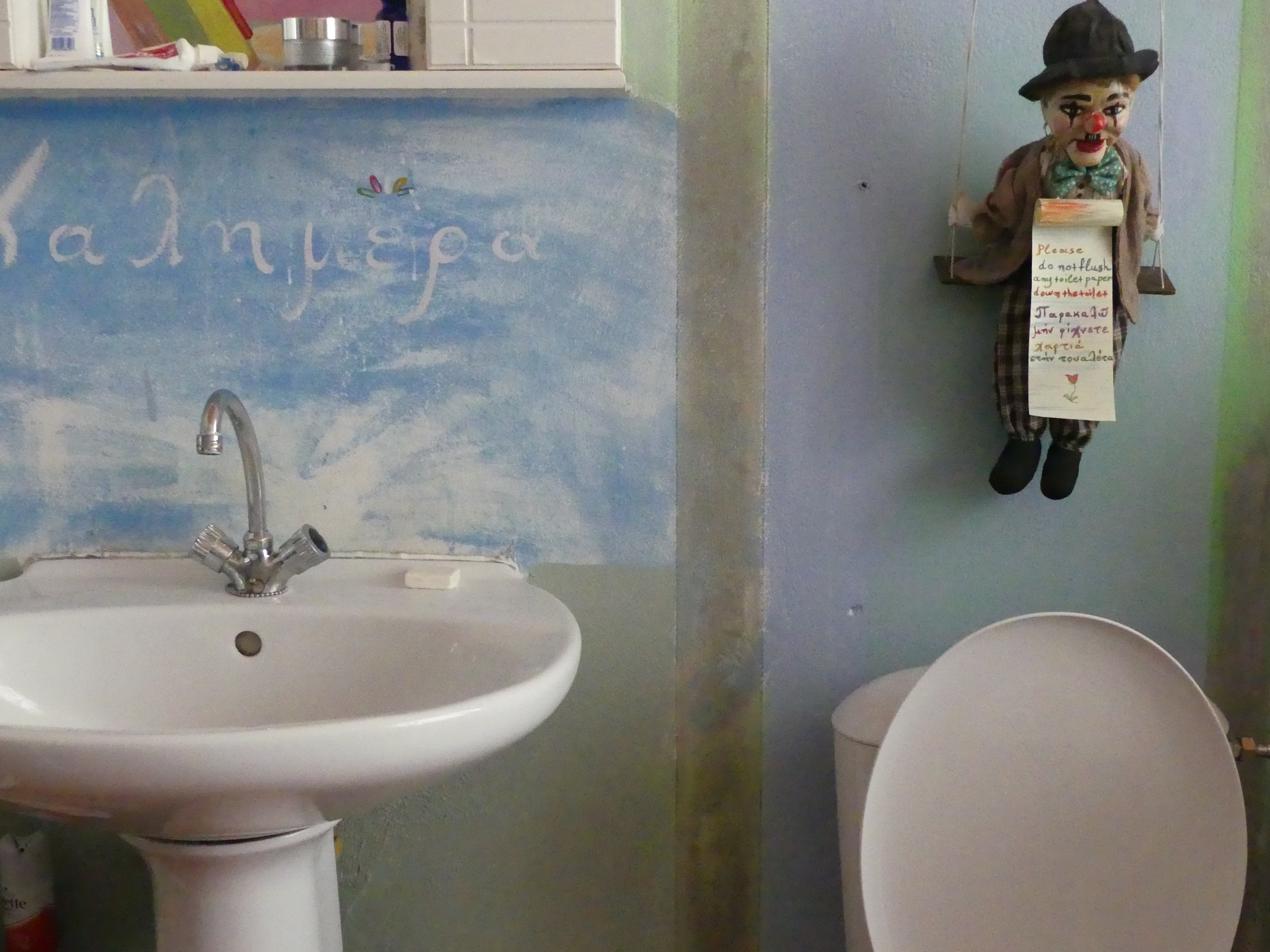 The puppet’s sign reminds you that, in Greece, you cannot put paper in the toilet.