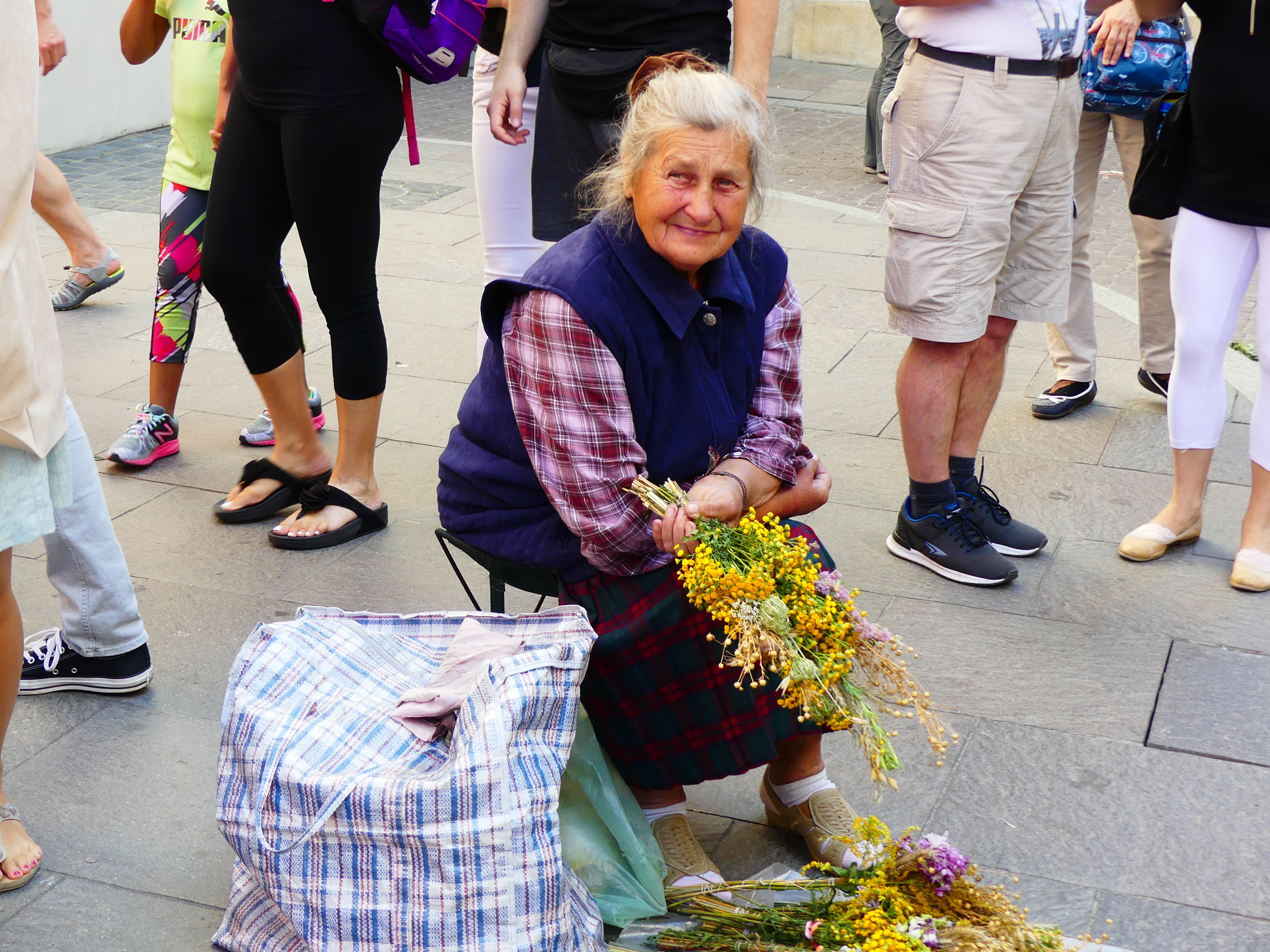 Today is a Catholic holiday, The Feast of the Assumption of St. Mary. Poles are very Catholic. This woman is selling flower wreaths for worshipers to take to church.