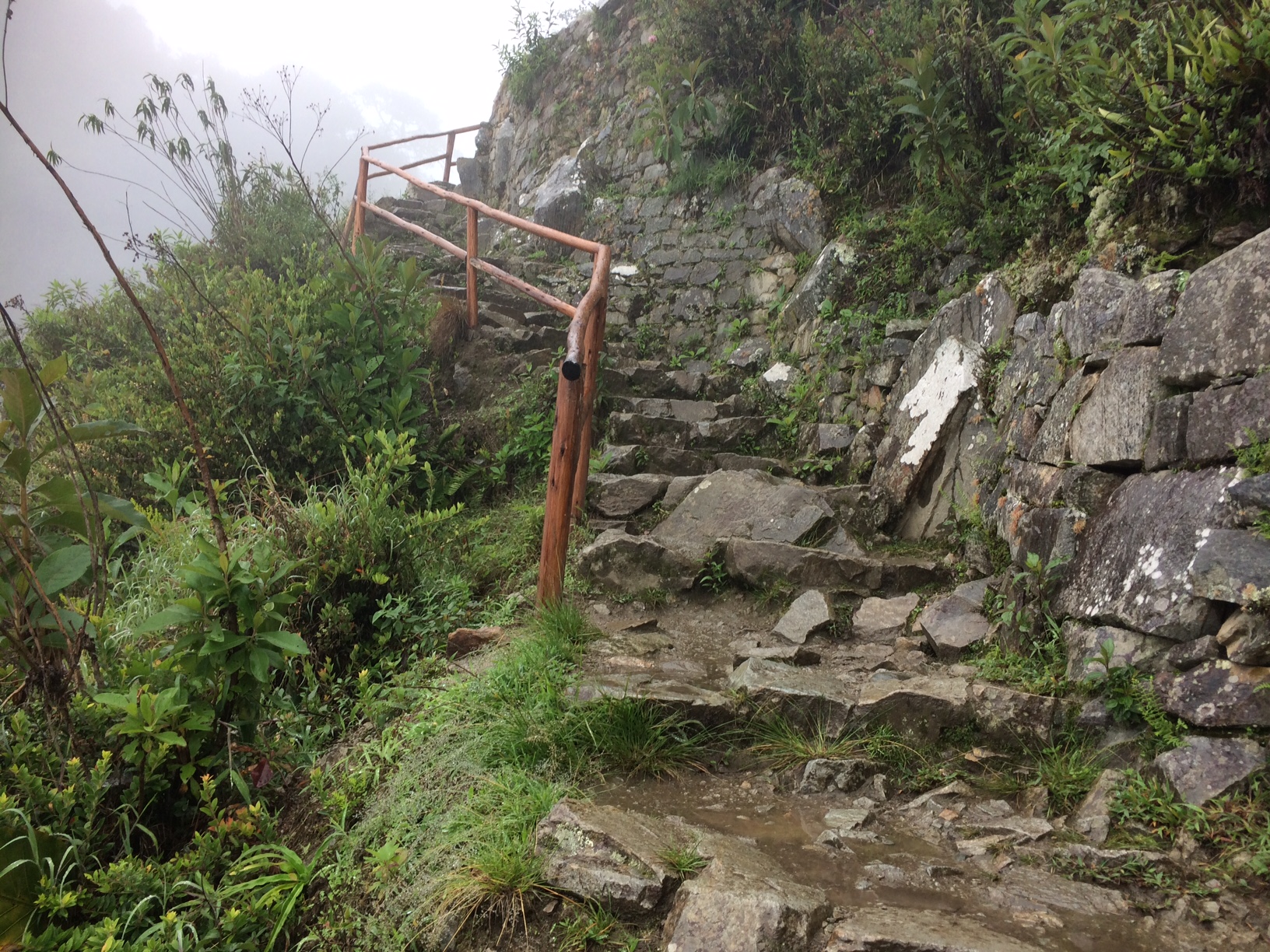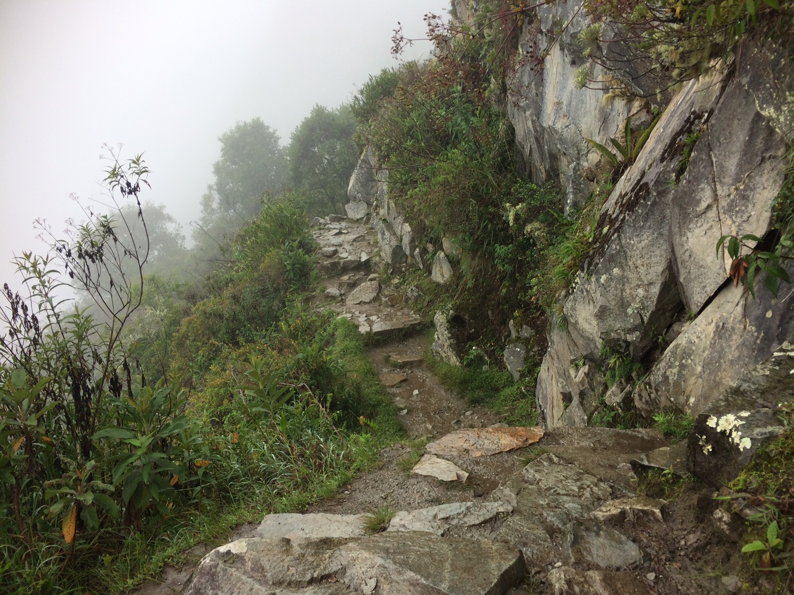 For some reason, I decided not to hire a guide for my Machu Picchu visit, which is probably why I decided to hike to the Sun Temple. I got within a quarter of a mile of it and turned around because the people coming down the trail said they couldn’t see the Sun Temple through the fog. In a way, this was a huge relief to me because it gave me an excuse to avoid further navigation along the slippery trail with the sheer drop on one side and the sheer cliff on the other.
