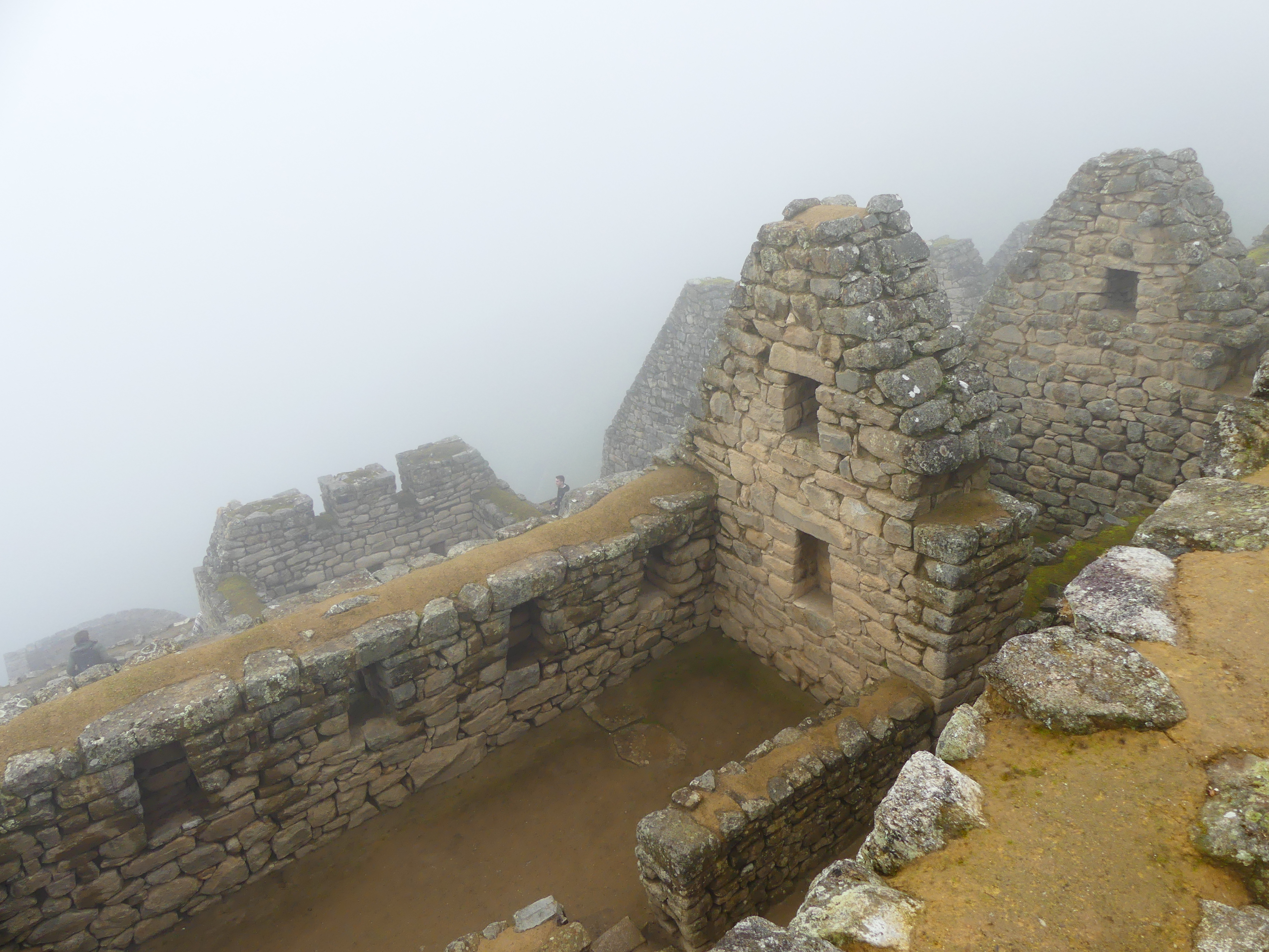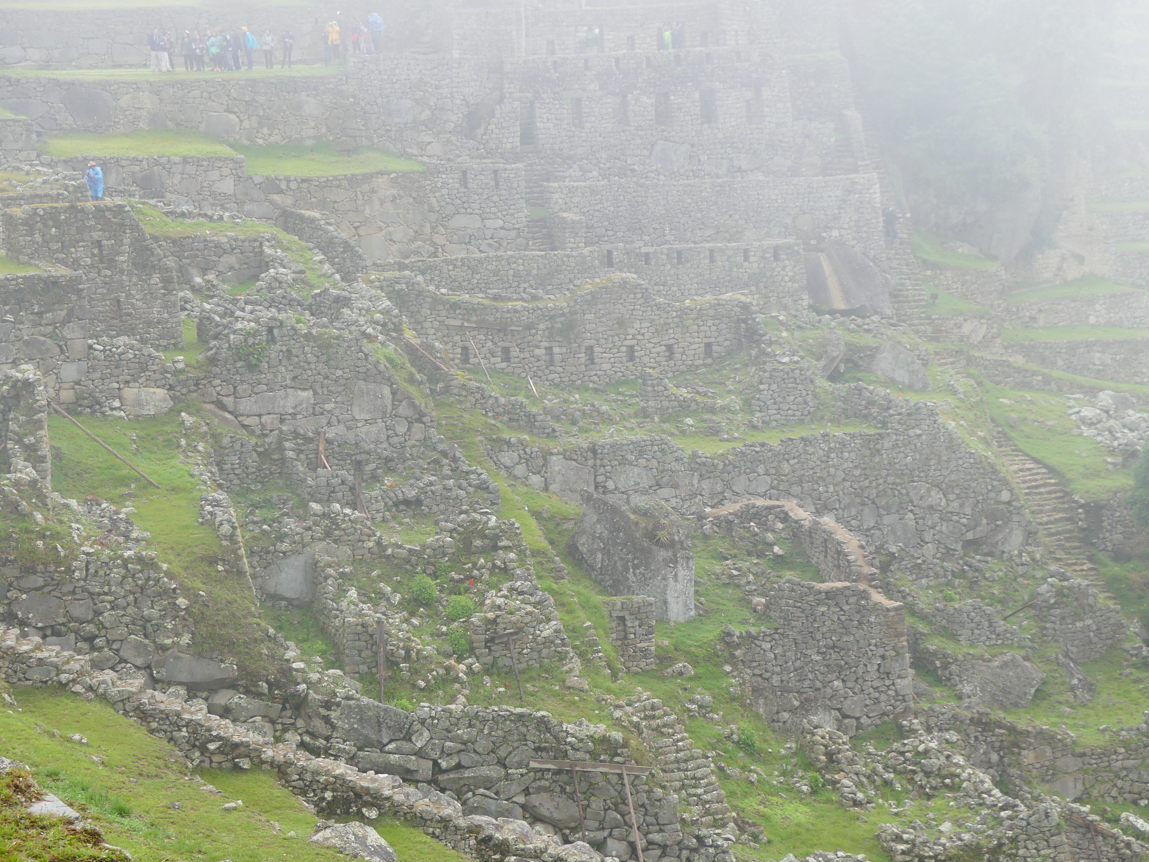 Anyway, I survived the bus ride up and was super excited to be there! I expected a lot of drama — giant expanses of granite ruins over hundreds of acres on the top of the Peruvian world. The drama was there alright but I had to imagine some of it because the whole mountain was enshrouded in fog. Visibility was further impeded by the fact that it was raining and the $3 rain poncho I bought would only keep my head dry if I allowed it to fall over my eyes.