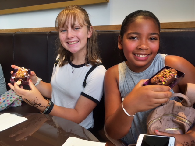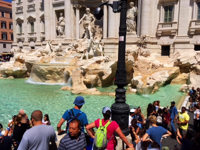 We started our first day at Trevi Fountain, which was once the terminus of the Roman aqueduct and the largest of thousands of Roman water holes in 4th century CE.  The weather is in the 90s, so Avery and Bella found a spot in the shade among a throng of tourists and threw their coins into the pool. According to legend, this will assure their return to Rome. I did it in 2007 and it worked!  I was interested to learn that every year tourists toss more than $1 million in Trevi fountain, all of which goes to feed the poor.