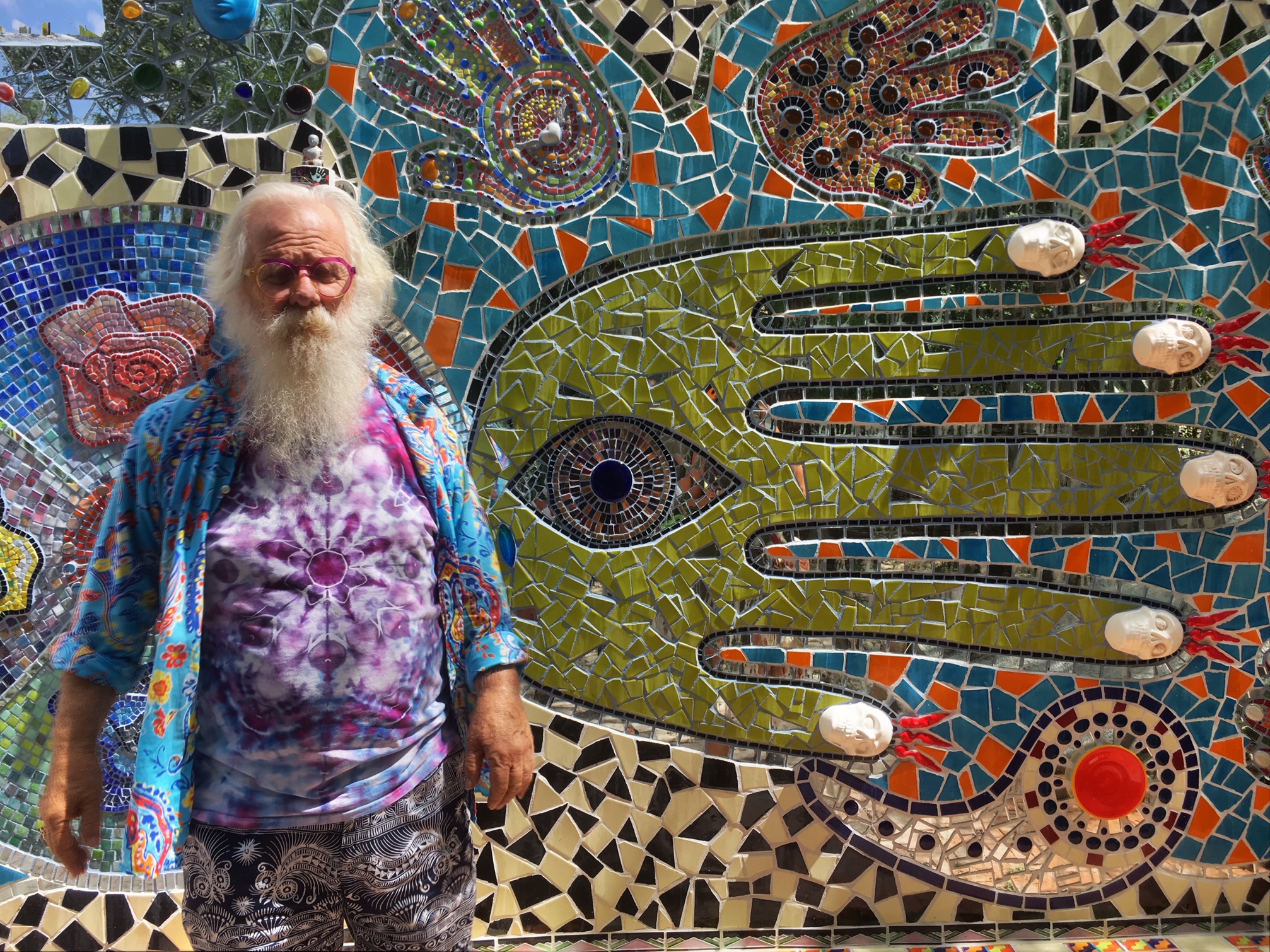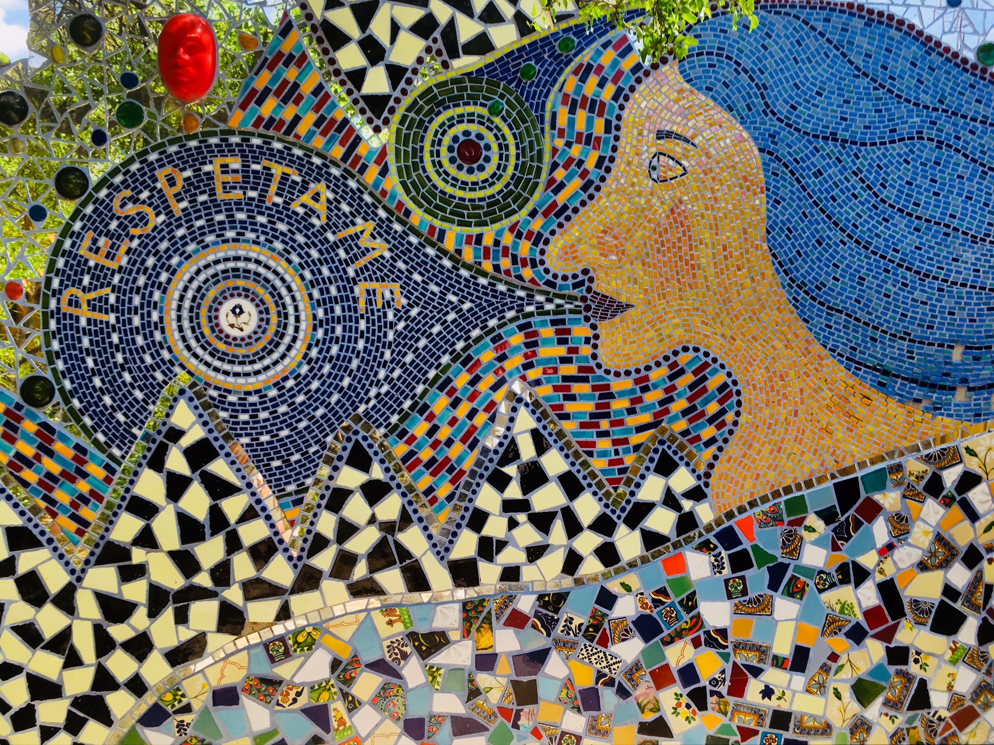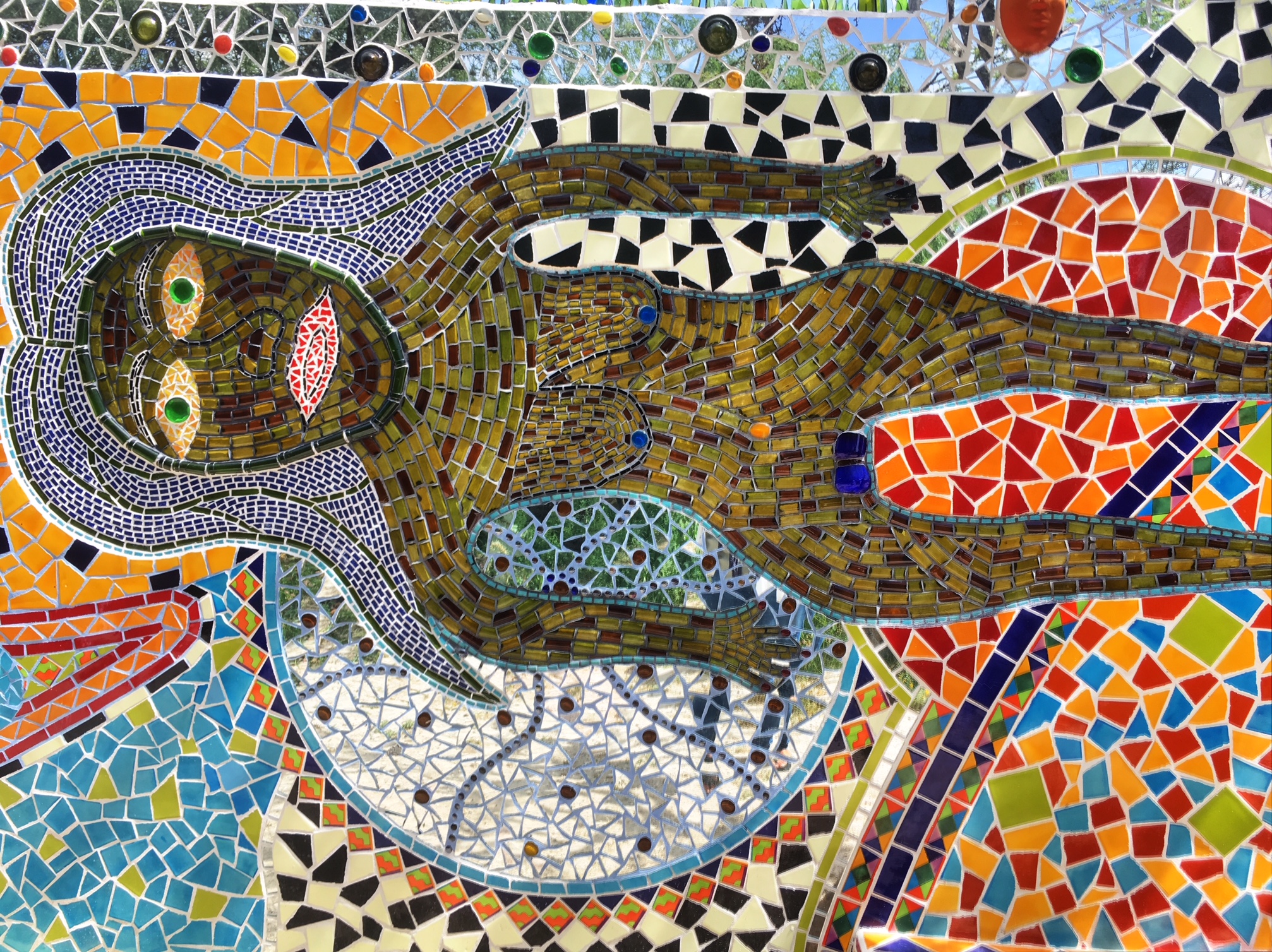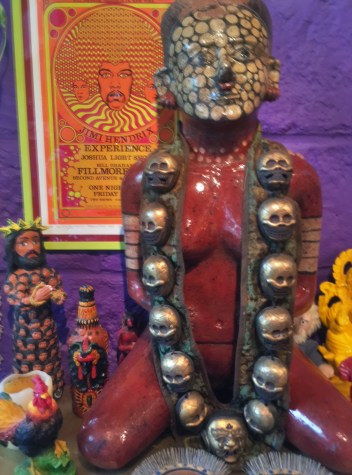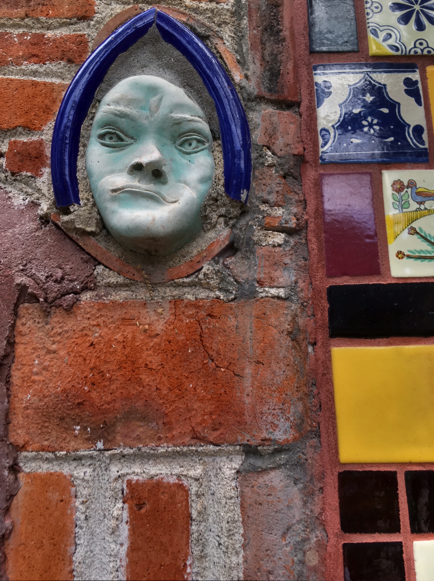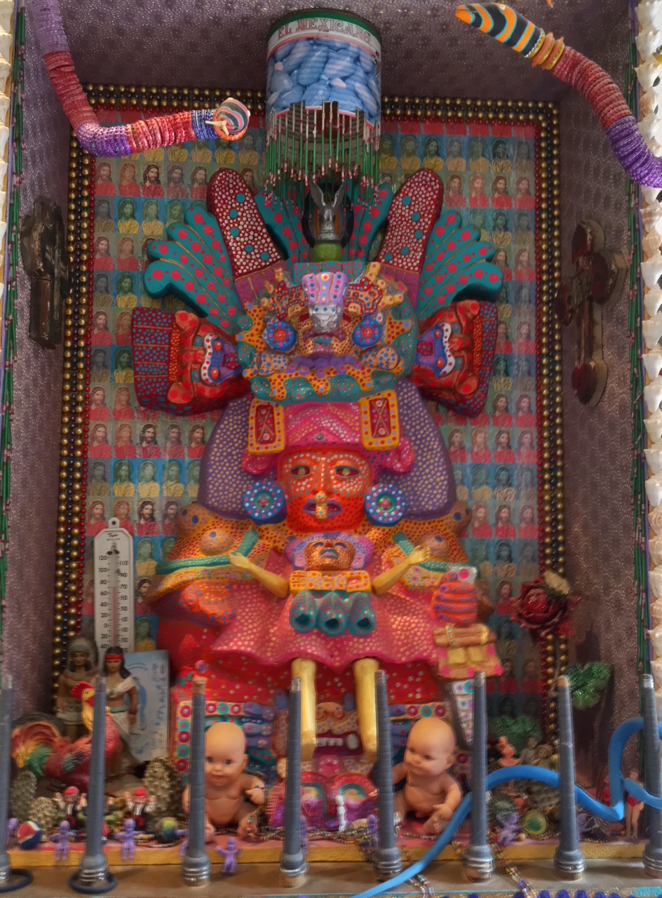 Anado has an unrelenting passion for creating art in all kinds of media that is technically expert but also unmoored and deeply metaphorical.  So much of it combines the sensibilities of 60’s psychedelia with traditional Mexican motifs and processes. The pieces, which include several buildings, employ  bright colors, mirrors, skulls, animals, tile and cultural artifacts.