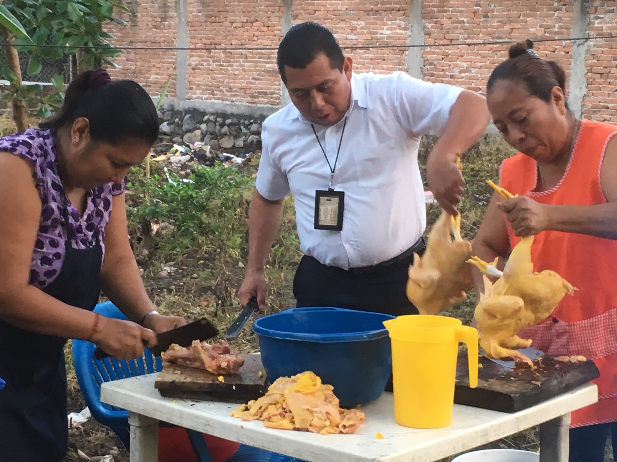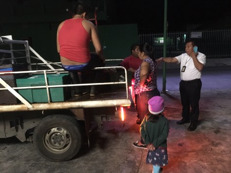 Picking up the chicken from a truck that had just arrived from el campo.