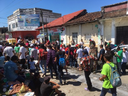 After everything was perfectly cooked and seasoned, we loaded the troughs of chicken and rice into the back of a pick up and headed 20 miles north to Huitxla, where the members of the Caravan had slept the night before. Within seconds of our arrival in the town square, a long line formed at the back of our truck bed. People were hungry, thousands of them. Huitxla is a poor community and there were no NGOs there except for those couple of Red Cross vans.