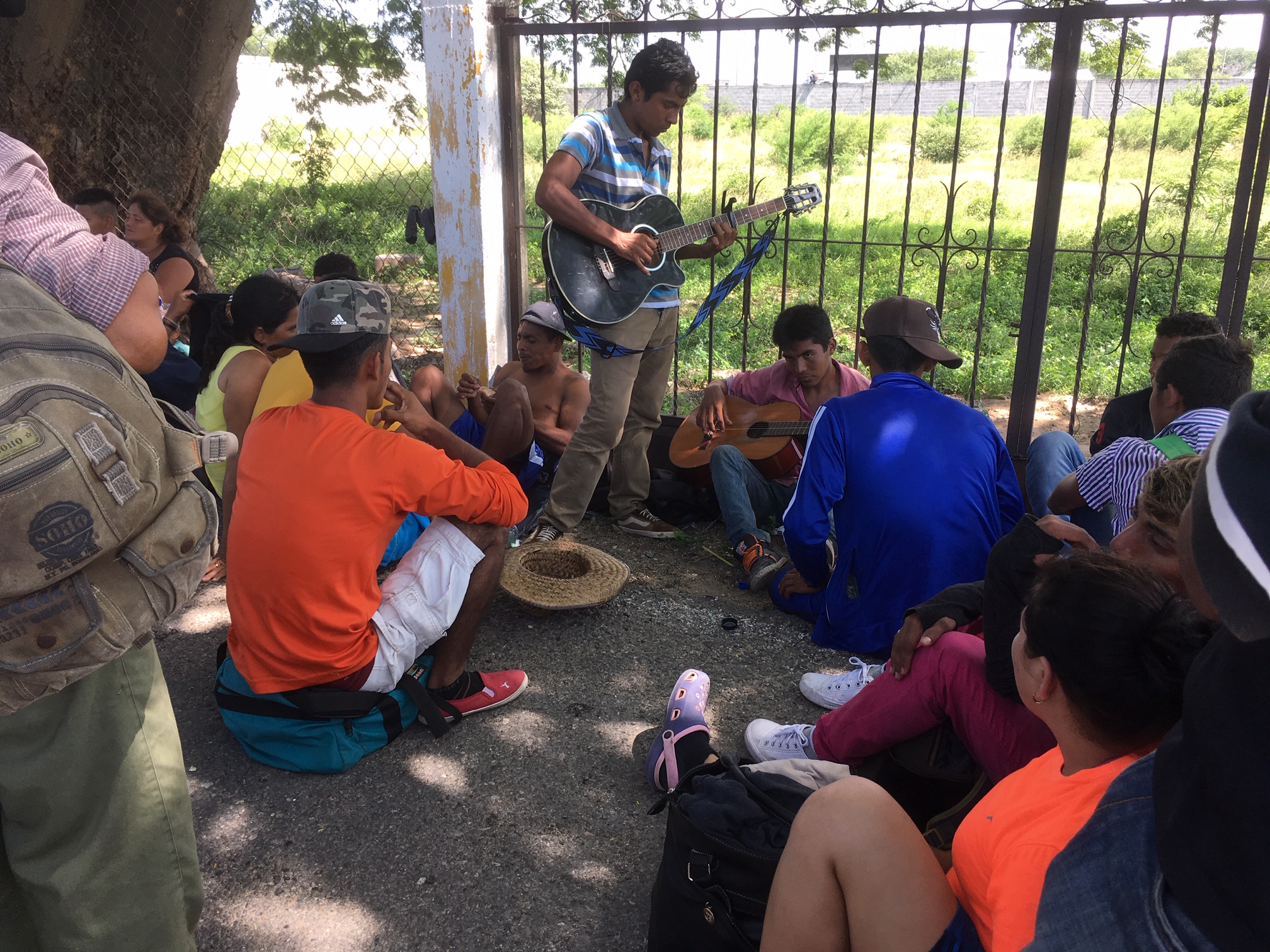 Based on our experiences last week, we were not surprised to find that the people in the Caravan were, in spite of their exhaustion and hardships, caring, peaceful and social. A group of young men playfully taunted me for 20 minutes because the apples and milk are “para los ninos!” Another group of young people approached me at the front of the food line to say they didn’t need to wait in line because they were special — “we are LGBT!”. I gave them hugs and told them they were in the right town and one of them suggested that some of them may remain here