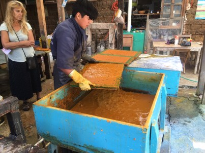 You can read more about what tourists do in San Cristobal at many sites https://www.telegraph.co.uk/travel/destinations/central-america/mexico/articles/San-Cristobal-de-Las-Casas-Mexico-Tales-of-the-Unexpected/ but you probably won’t read about Taller Lenaterra, which we came upon by accident. Taller Lenaterra is an artists’ cooperative that makes wonderful handmade paper, posters, and books. We got a short tour of the paper making, which begins with “pulping” used paper and then mixing it with, in our case, macerated marigold flowers. The graphics are earthy and playful, combining modern designs with those of the ancient Mayans and indigenous groups.