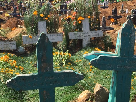 The town cemetery is an ocean of crosses. The green ones are for children. Many of the grave sites were decorated with blankets of marigolds and pine needles in anticipation of the Day of the Dead.