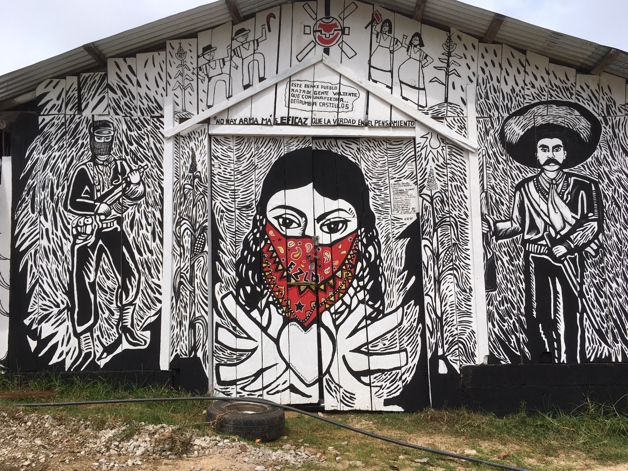 The young man took us inside the gate to a small wooden building for our second interview. Inside, we introduced ourselves to a man and a woman in black masks sitting behind a large desk. They had smiling eyes and didn’t ask about my career in “policia.” Like the first interview, the second didn’t provide any information about the Zapatistas, only about us. But after a few minutes, the man and woman invited us to tour the site. We could take photos of the murals and the buildings but not the people. Diane handed them a dozen Spanish language books we had brought for the children’s school and we stepped outside.