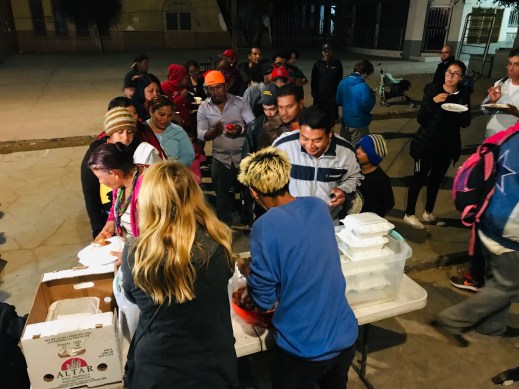 Caravan members remain peaceful and polite. In the past few days, Diane and I have helped serve food at Enclave Caracol, an amazing community center that doesn’t turn anyone away (and they need volunteers if you are available!). People wait patiently in long lines for meals, help clean up, help with shopping, express gratitude and humor. We delivered hundreds of chicken meals twice to Benito Juarez stadium…although things did get a little intense when we arrived for the third time and we had to leave with the chicken. But, as Diane says, the prospect of meat — and missing out — makes hungry people a little crazy. The scuffle at the border? A handful of frustrated people during a very short period of time caused a wildly disproportionate response by US officials and the international media. Things are quiet here now. Although the conditions for serious trouble seem to be building.