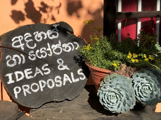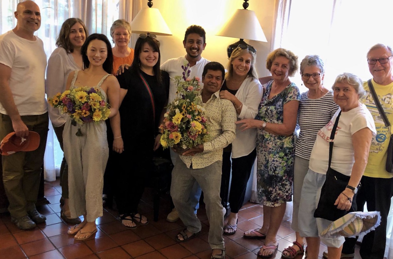 There are ten of us between the ages of 30 and something north of 75. We are Scottish, Irish, Polish, English, Canadian, and Californian. Plus our four Sri Lankan hosts. We begin every day at our white touring van where our driver, Kolum, is waiting for us with flowers, sampans, and the Sinhalese greeting, “ayabayon.” The air around the bus is filled with the fragrance of the burning incense Kolum has attached to the wind shield wiper. I love this ritual, a reminder to be mindful and grateful.