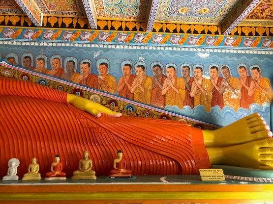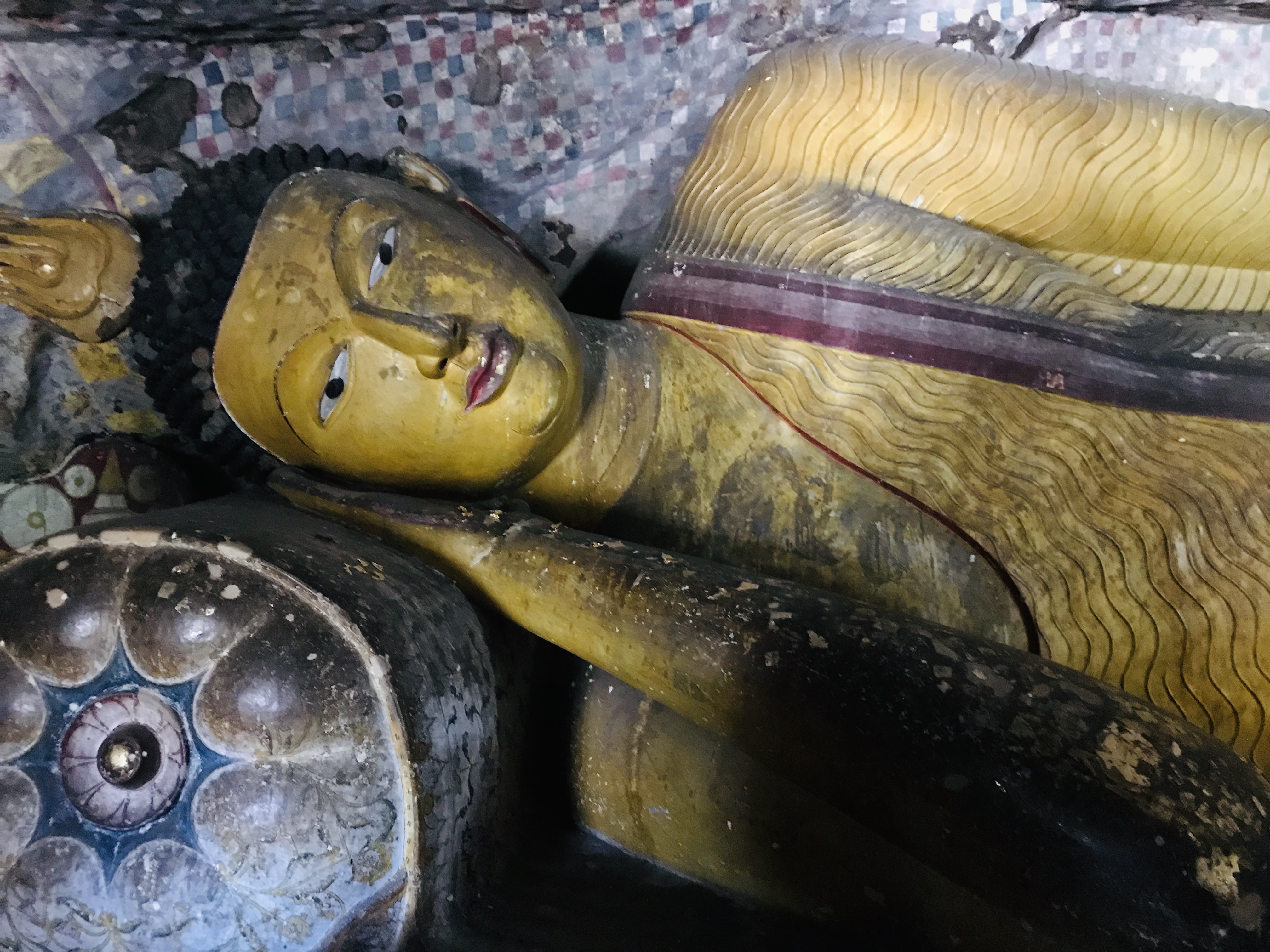 We also climbed another important place of pilgrimage, Sigiriya Rock Fortress, through its carved and painted walls, and past the palace ruins to the temple at the top. But actually, I didn’t get to the temple at the top because, to get there, you must climb about 100 feet on a metal stairway along a sheer cliff and I am still weird about sheer cliffs.