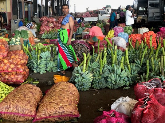 I love this photo because of how the man’s sarong has the color and flow of the produce