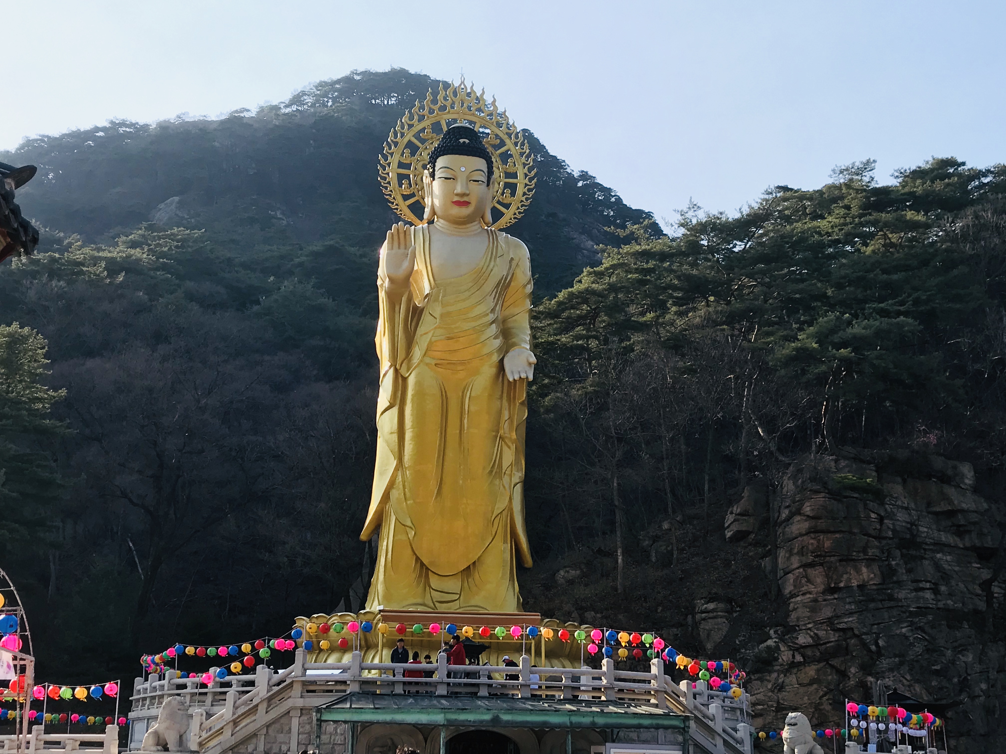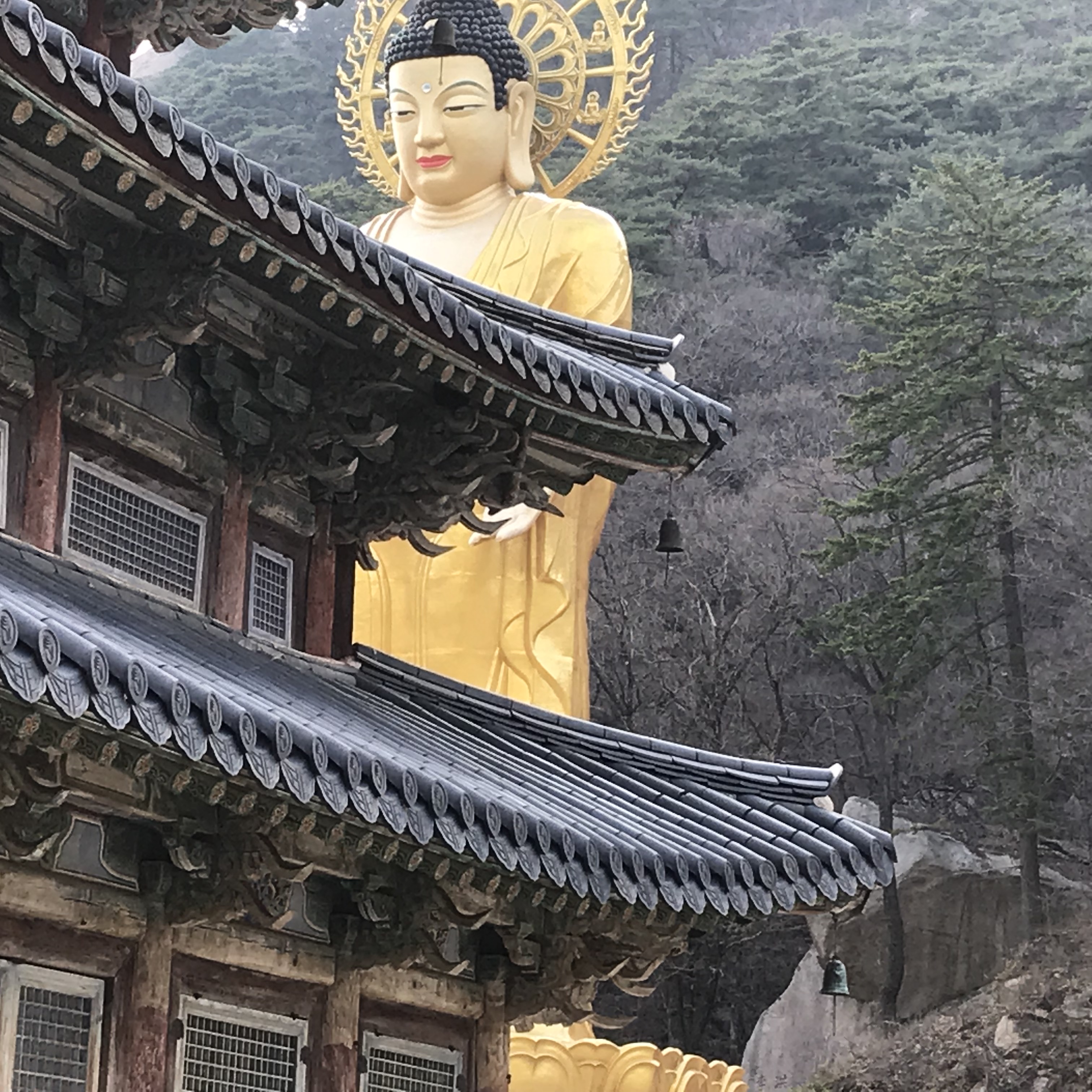 We are in South Korea. We are standing in the dark at the base of a giant golden Buddha at 4:30am. The Buddha is framed by mountains and a wooden pagoda. I’m wearing six layers of lightweight cotton, unprepared for the near-freezing temperatures we will endure for the coming hour. Shaking, I find myself trying not to wonder why I thought staying at a temple in the mountains was a good idea.