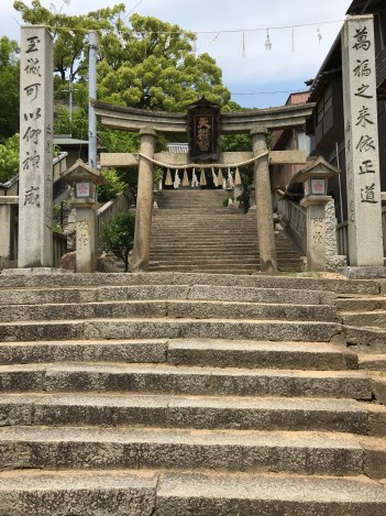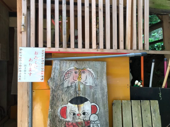 Part of the temple path is called “cat alley,” really more of a cat path, meandering through the deciduous forest and pine trees. Along the walls and fences there is a lot of cat art, delightful and funny. I don’t see any cats, which, I tell myself, is to be expected if you are looking for them. Still, the whimsy of this woodland gallery energizes us, so instead of taking the rope tram, we climb for another half an hour to the temple at the top of the hill. There, we are rewarded with breath-taking views of the sea and the inland islands.