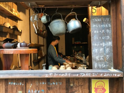 On our first day in town, we leave our guest house early in search of coffee and something to eat. The air is filled with the briny fragrance of the Seto Inland Sea that is Onomichi’s front door. A gray-haired man on a bike breezes by, waving and calling out “Ohayo! Good morning!” before becoming a blur in the next block. Music from Brazil trickles out of small speakers along this outdoor “mall,” where glaring CFLs hang over wooden benches of handmade pottery and an older woman is filleting a dozen fish at something that looks like what we used to call a tv tray. Bikes are parked unlocked. The sandwich boards are only in Japanese.