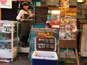 After all that folk art education, I tried to get off the beaten track for meals as well. My favorite was street food at the Sujin-Shimachi “beer garden” near Kyoto Station. It’s just far enough from the tourist hotels that the feeling was relaxed and local. There were a lot of Japanese options but most were meat so I went for the Thai food. OMG, our Japanese chef made the best pad kee mao I have ever had!