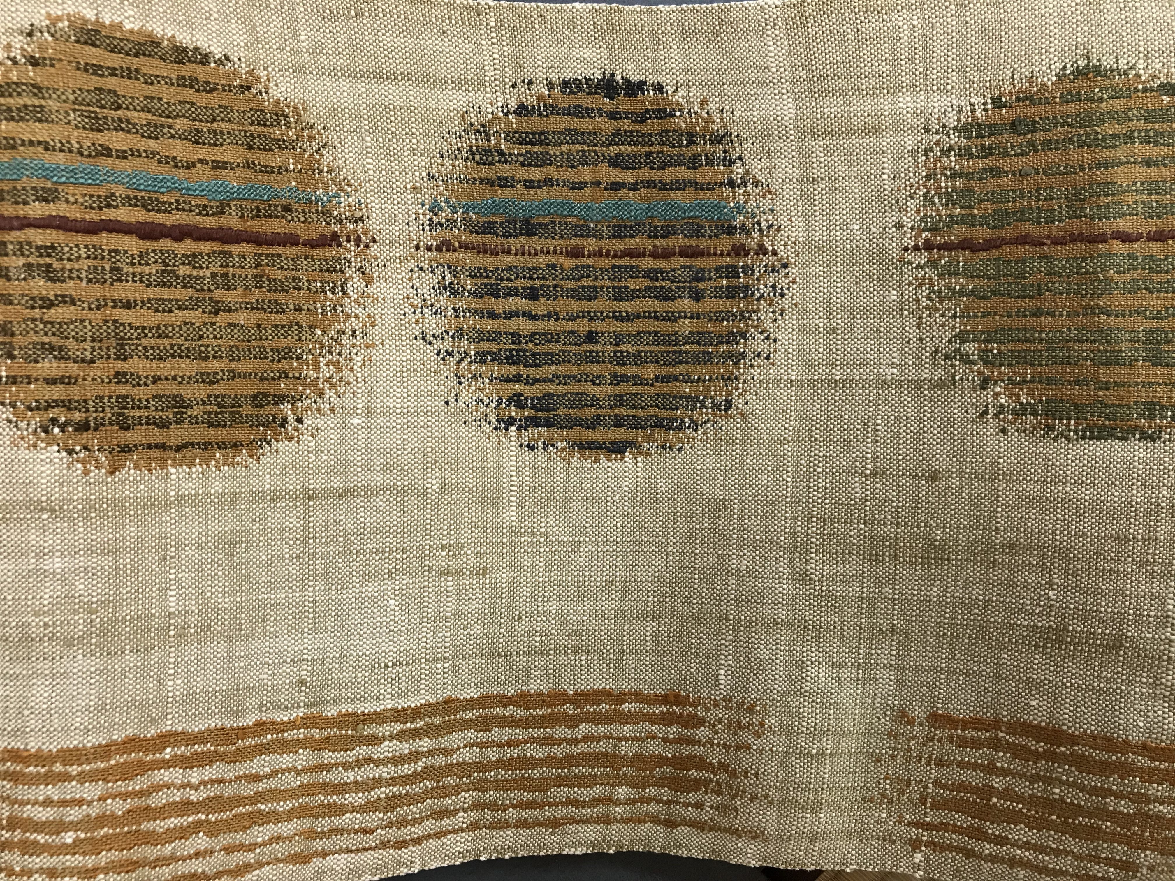 Some of the most interesting textiles at Orinasu-Kan were made using a technique called “kasuri”, also known as “ikat.” Kasuri creates patterns on a woven fabric according to the ways the threads are “tie-dyed” before they are woven.  Check out this short article about kasuri (ikat) that provides a better explanation.   https://www.clothroads.com/kasuri-and-indigo-threads-that-blur-and-bind/