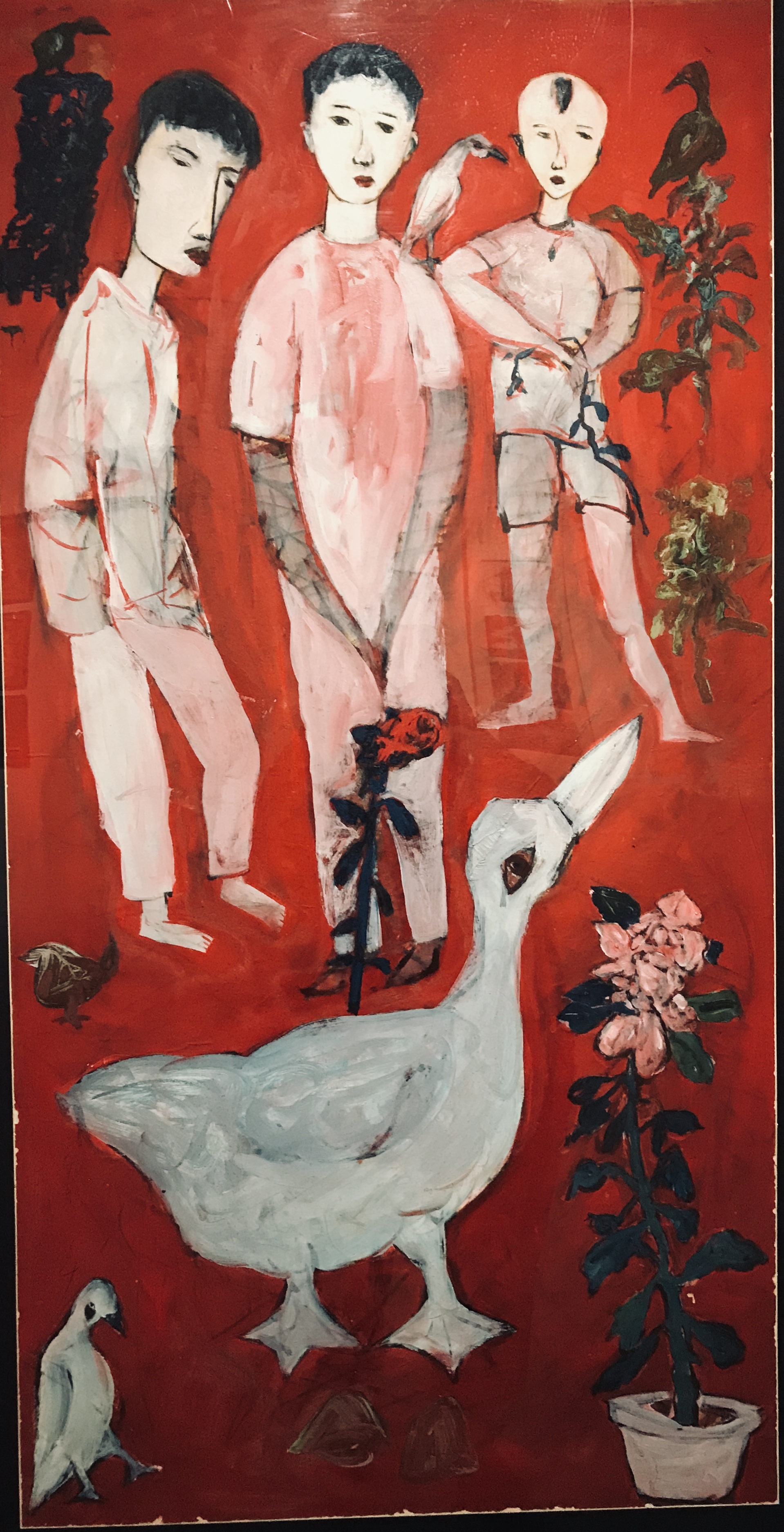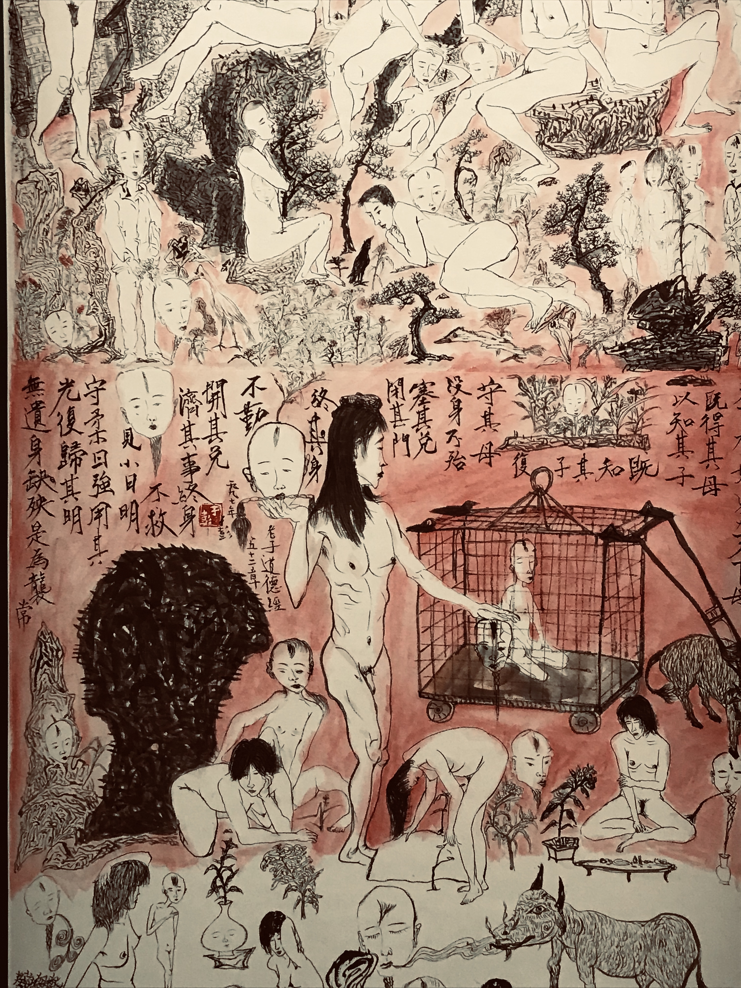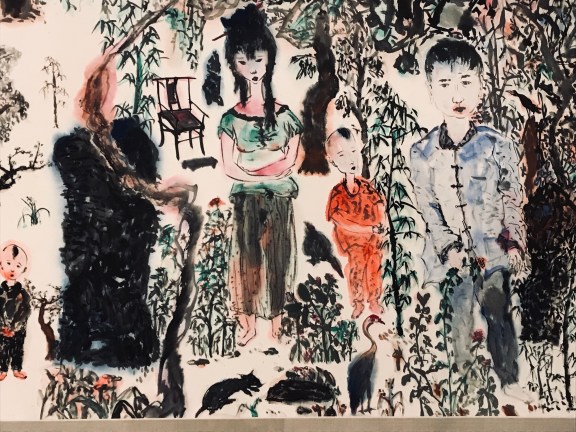 Most of Yu Peng’s paintings are colorful narratives of people, landscapes and animals. They express both innocence and worldliness. They are serious but whimsical. The people seem at peace but they are a little mysterious! We need to interpret their stories, just like real life. (What about all the naked women he painted? They seem so relaxed — is Yu Peng telling us Taiwanese women have nothing to hide? They are comfortable with their sexuality? )