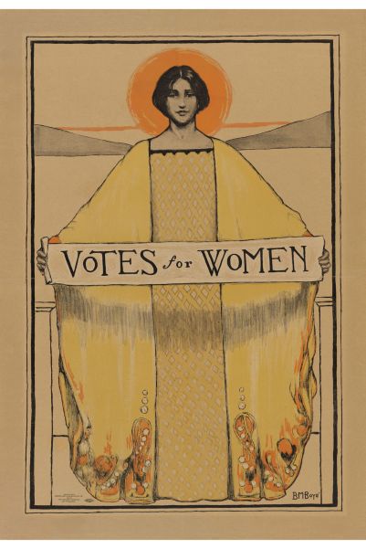 In 1911, California became one of the first states in the US to grant women the right to vote, nine years before the passage of the 19th Amendment to the US Constitution. (And remember, only men had the power to make that decision so all the more hopeful….) As part of the campaign for women’s suffrage in California, Bertha Margaret Boye was commissioned to design a poster. Her art deco creation features the sun setting behind the Golden Gate Bridge as a backdrop for a robed suffragist.