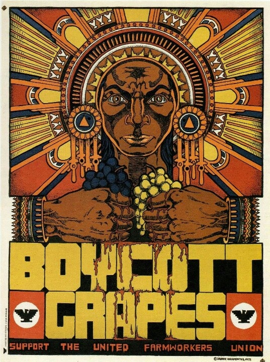 The boycott preceded the internet, and Chavez needed creative ways to get the word out to the nation’s consumers, so he distributed thousands of posters in all 50 states.  Among the most compelling was one by Xavier Viramontes, showing an Aztec warrior squeezing the blood out of bunches of grapes.