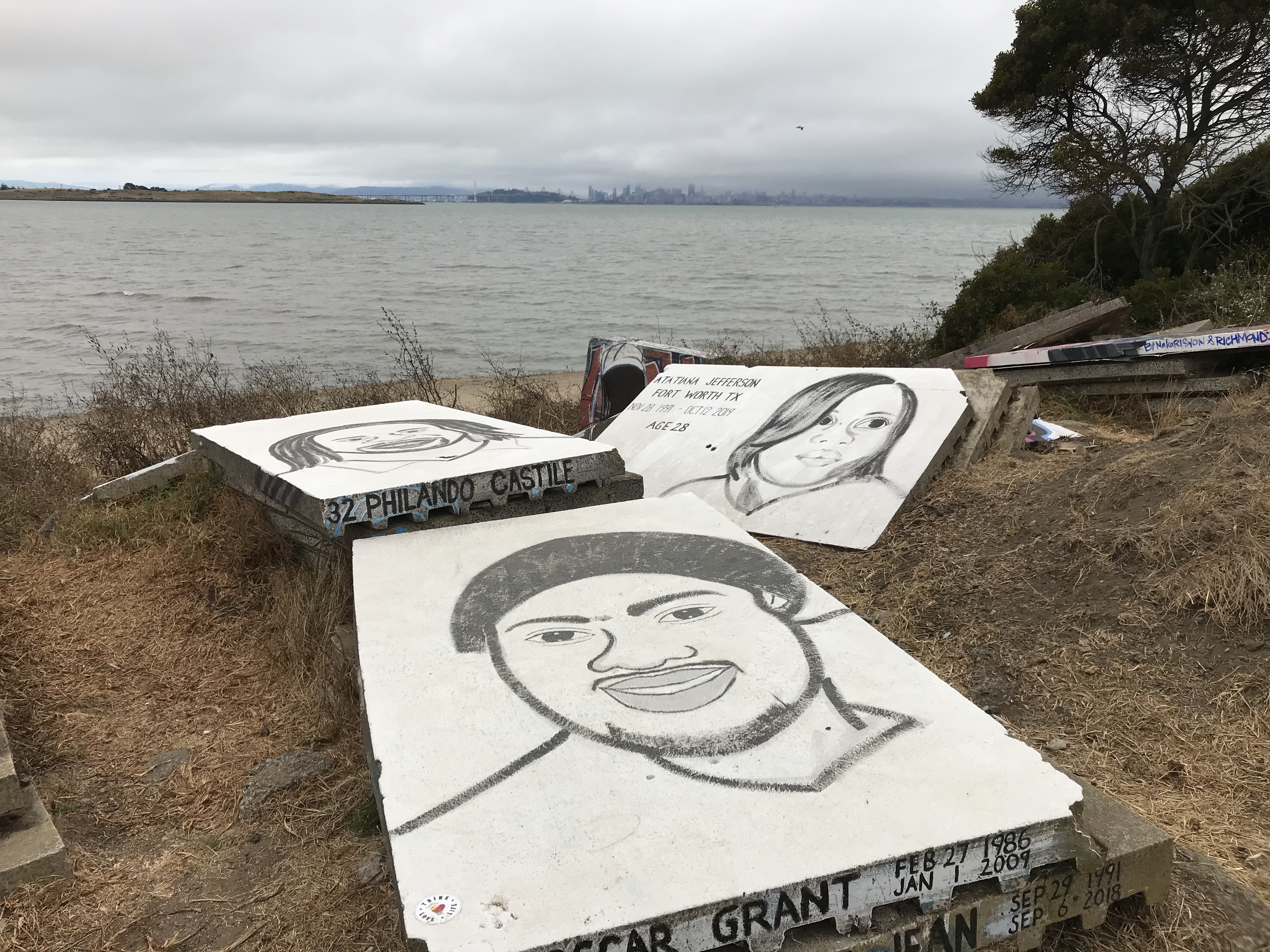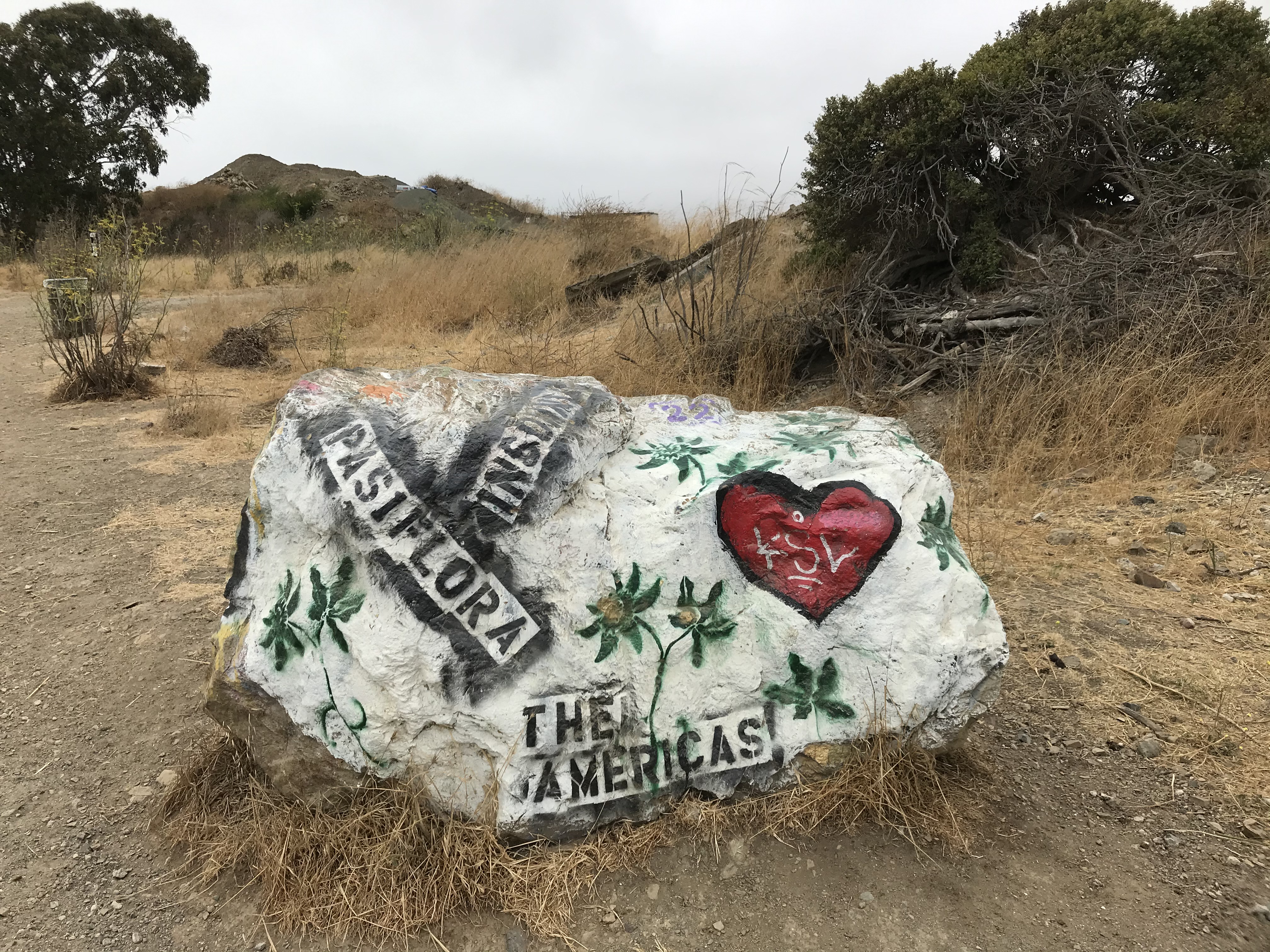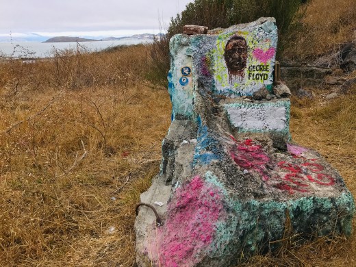 The Bulb is one of my favorite places for hiking on these July mornings. Rugged pathways meander up and down unpredictably through coastal live oaks, yellow fennel and red valerian, which host hundreds of graffiti and driftwood projects. Most are spray-painted on concrete slabs that were dumped here 50-100 years ago. The graffiti is mostly simple. A smiley face. Some hearts. Words that look like tagging. Some of the graffiti is political and obviously recent, with references to Black Lives Matter. A flag is planted in a pile of rubble announcing liberation. A group of young men are painting cement slabs with the faces of those who have died from police violence.