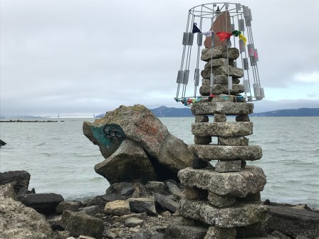 We stop to enjoy the priceless views of the expanse between Marin County and the Bay Bridge. Wind surfers swoop with the seagulls just beyond jagged outcroppings.